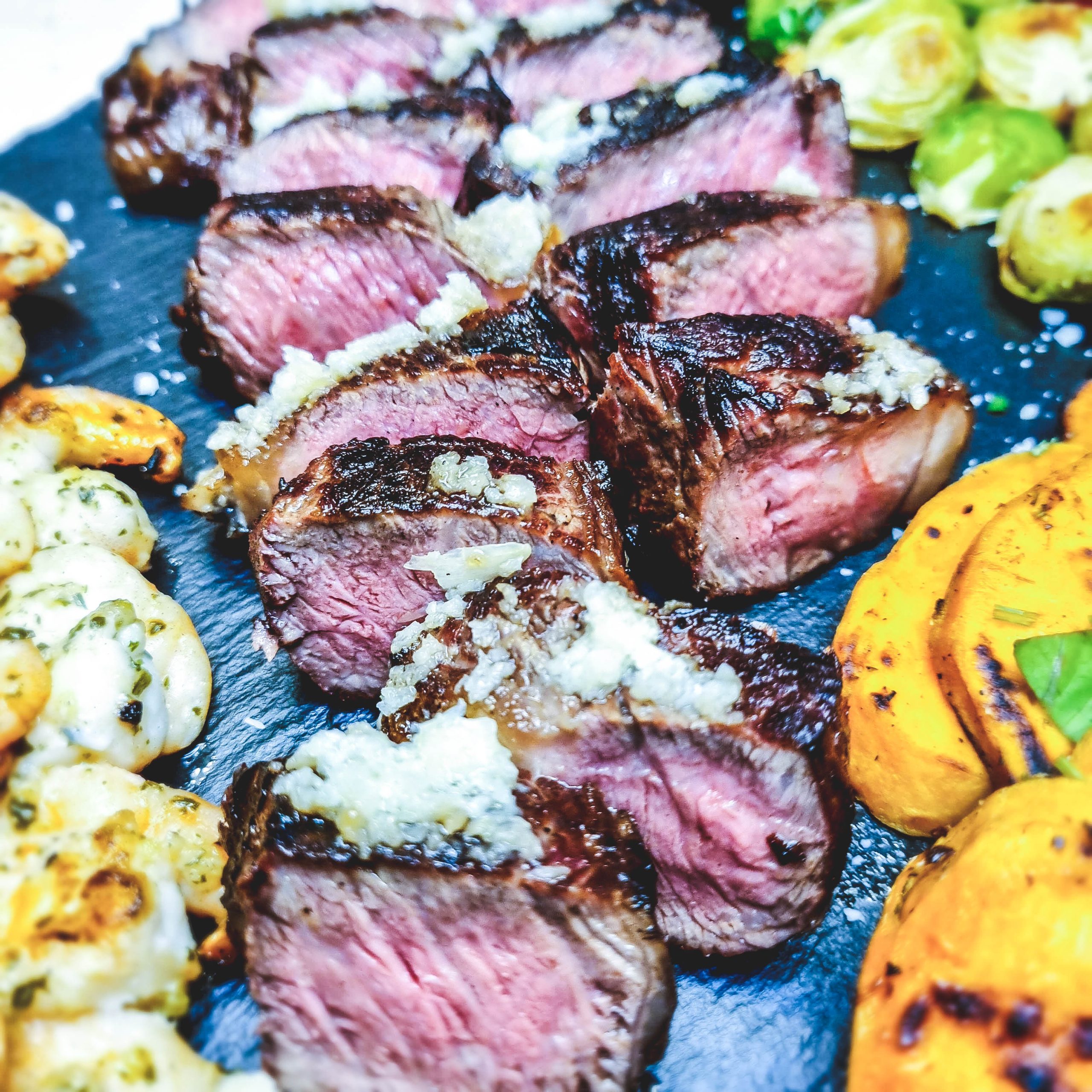 Steikas su Grilintom Krevetėm ir Batatais bei Ant Sviestuko Apkeptais Briuselio Kopūstais