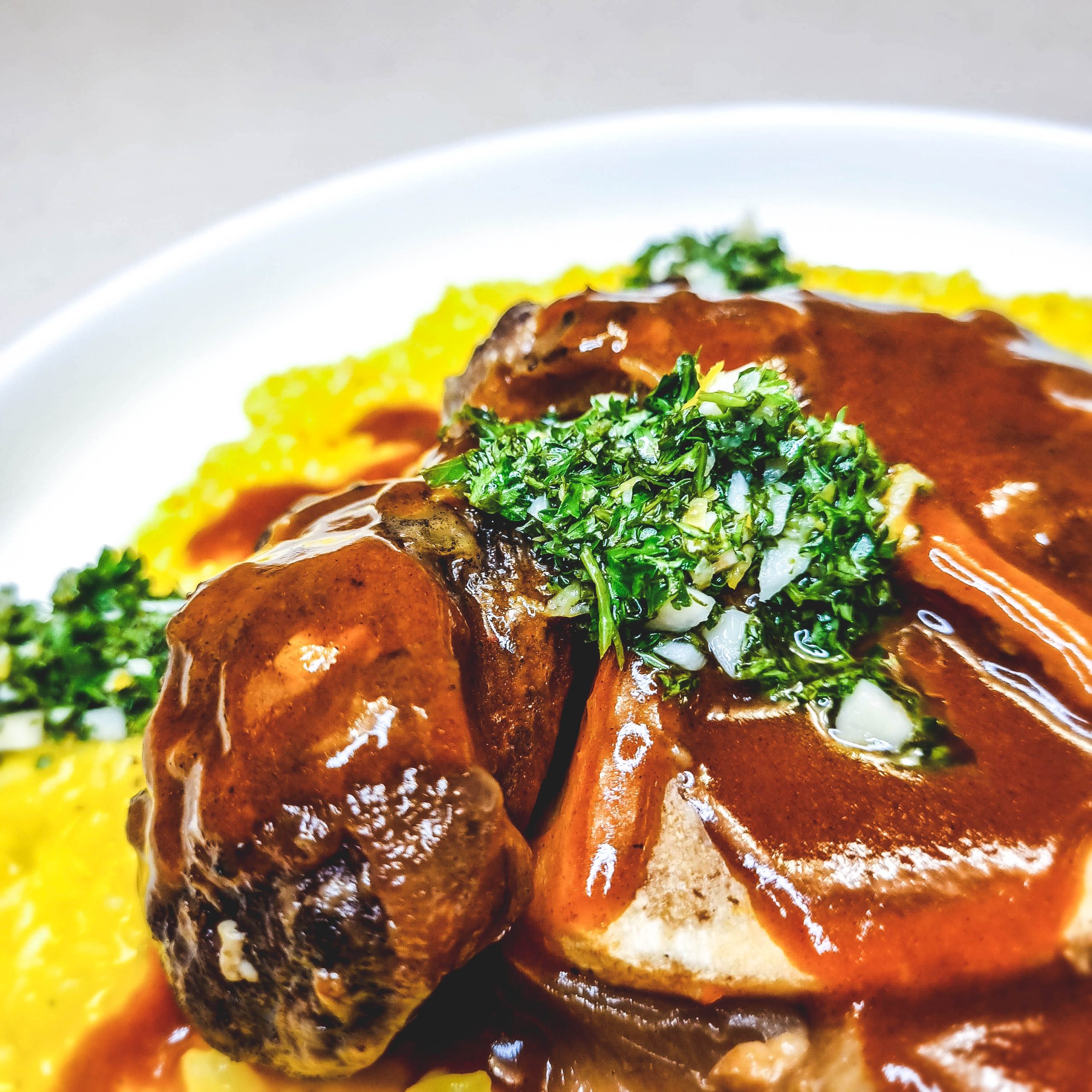 Ossobuco su Gremolata ir Risotto alla Milanese