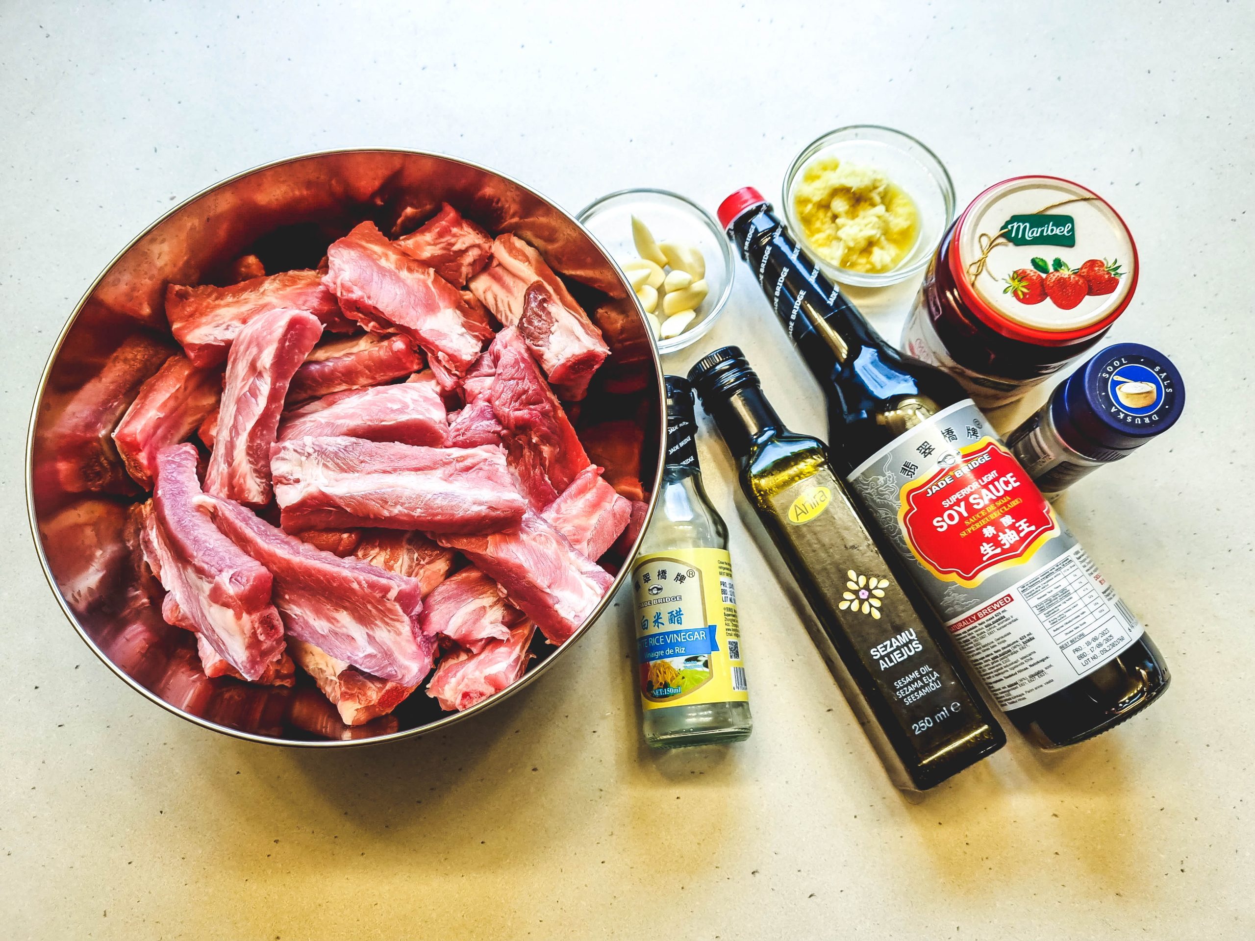 Sumaišom marinato ingredientus. Marinatą ir šonkaulius sudedam į marinavimo maišelius. Gerai išmaišom. Uždarom ir marinuojan šaldytuve per naktį arba keletą valandų kambario temperatūroje.