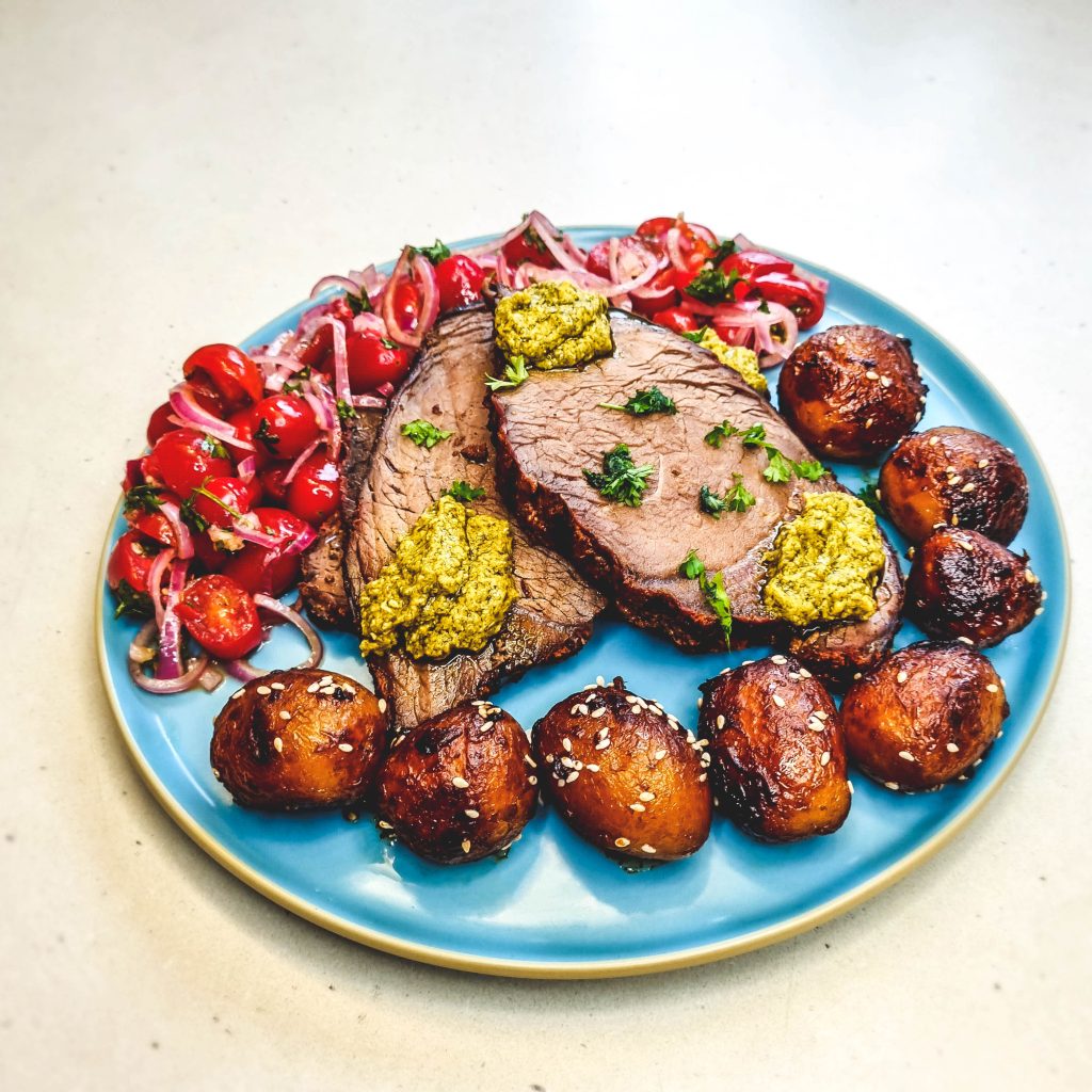 5. Traukiam lauk. Paliekam truputį pailsėti. Pjaustom griežinėliais ir pateikiam su medumi glazūruotomis bulvytėmis.