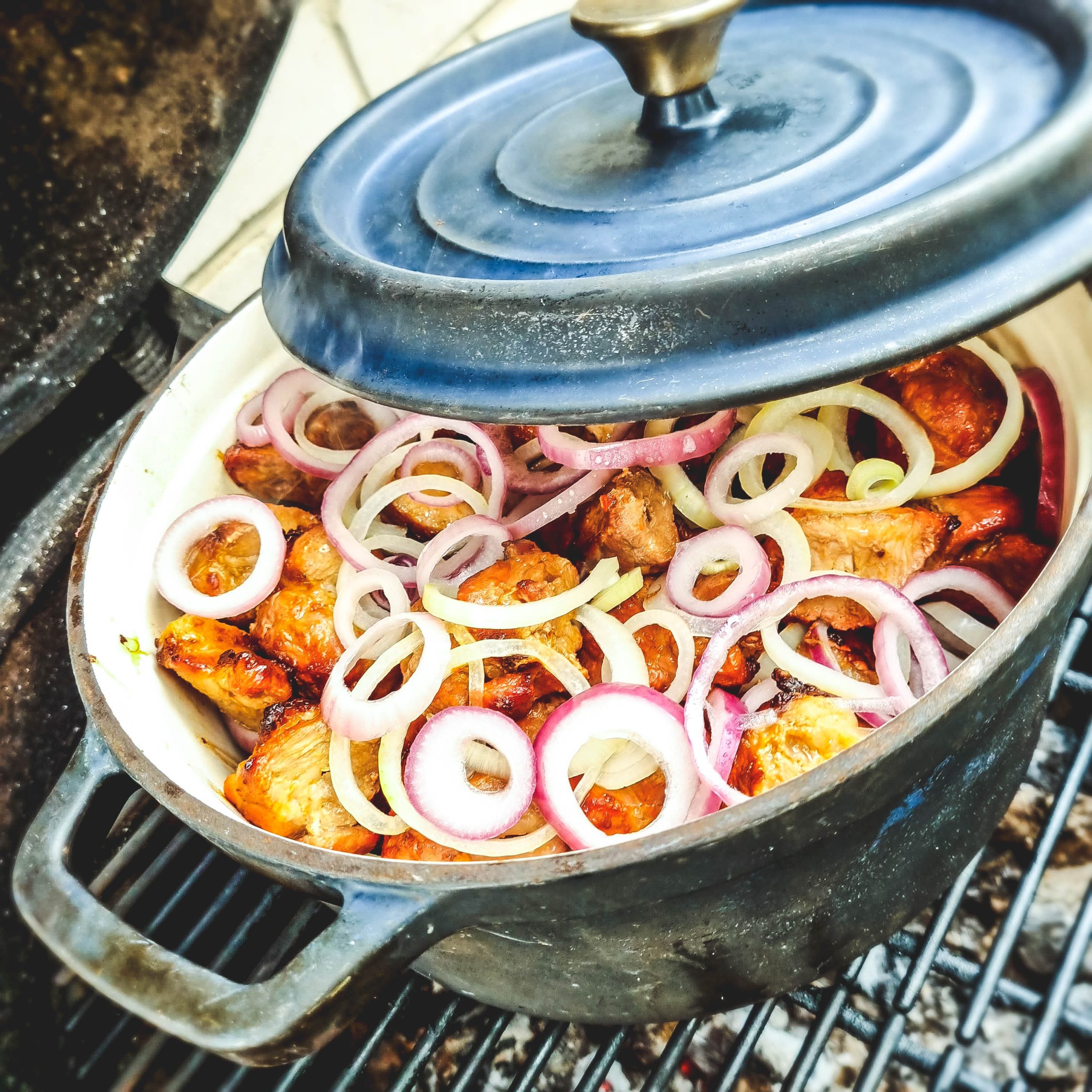 Šašlykus kepam pavartydami 20-40 min. kol atrodys iškepę arba iki vidinės 65C. Traukiam lauk. Numaunam nuo iešmo ir suberiam į ketaus puodą su švž. svogūnų žiedais. Išmaišom. Puodą uždengiam.