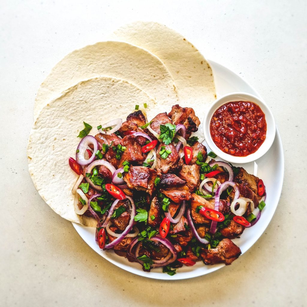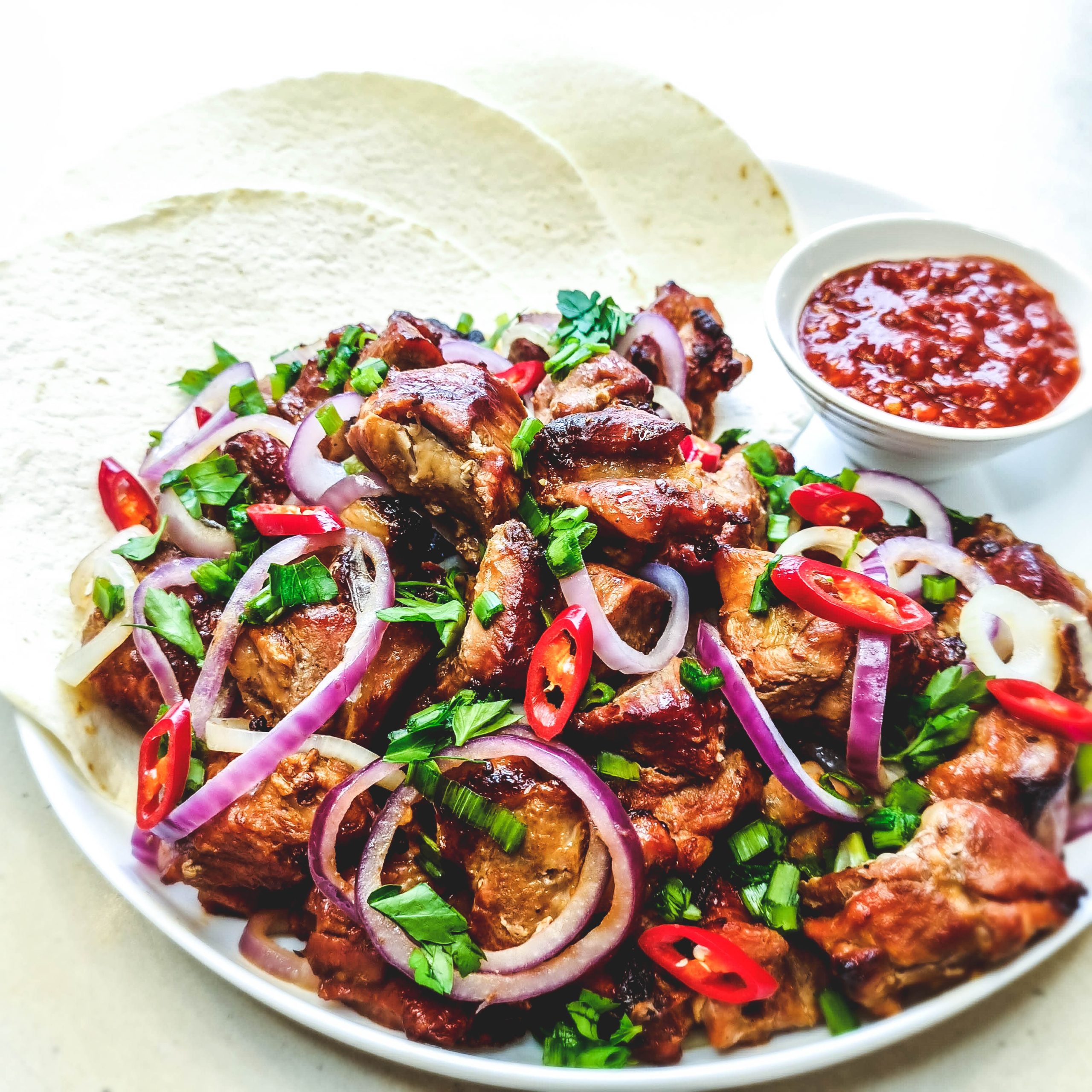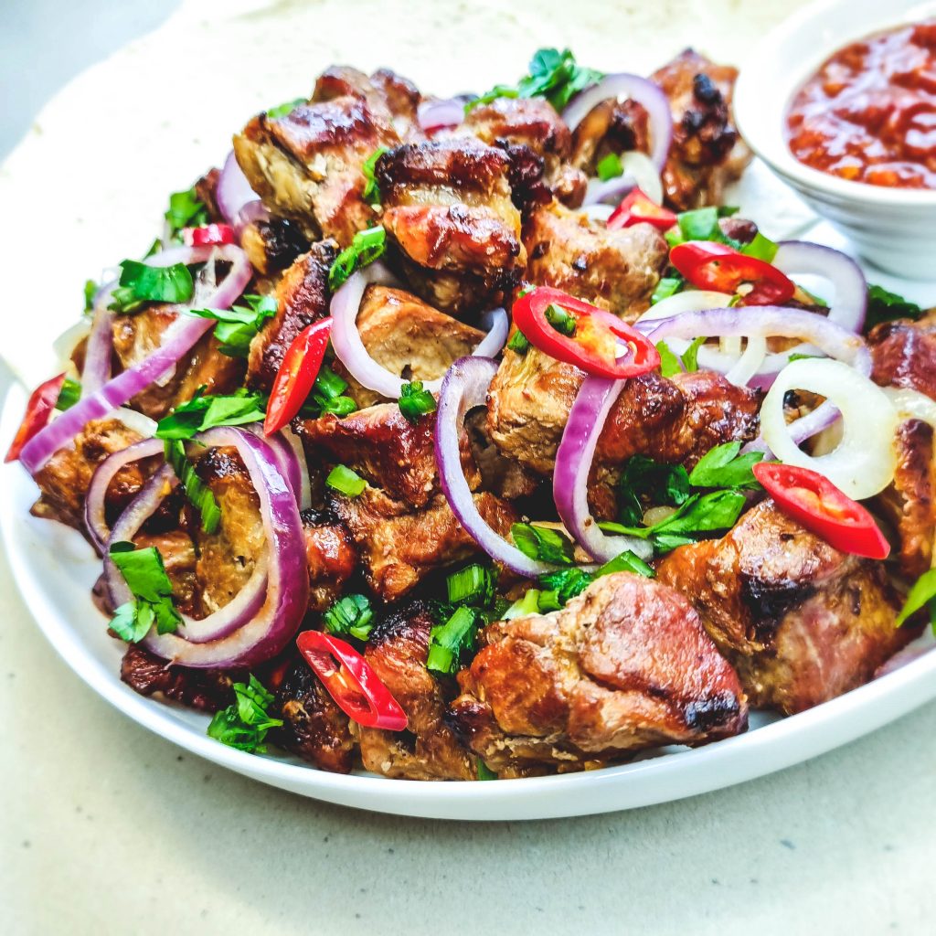 Pateikiam su lavašu, adžika, marinuotais ir švž. svogūnais iš puodo, trupučiu čiliukų ir žalumų.