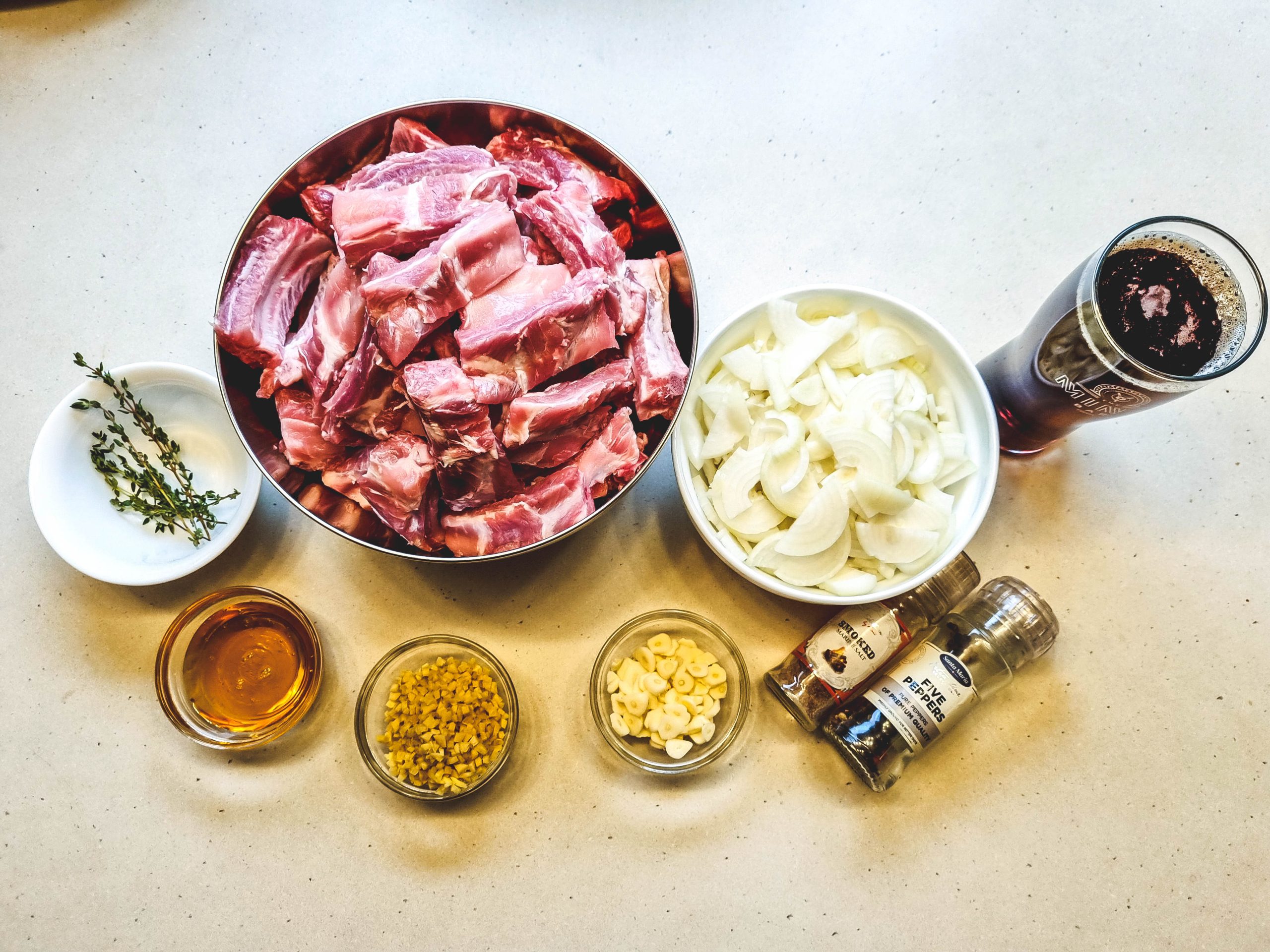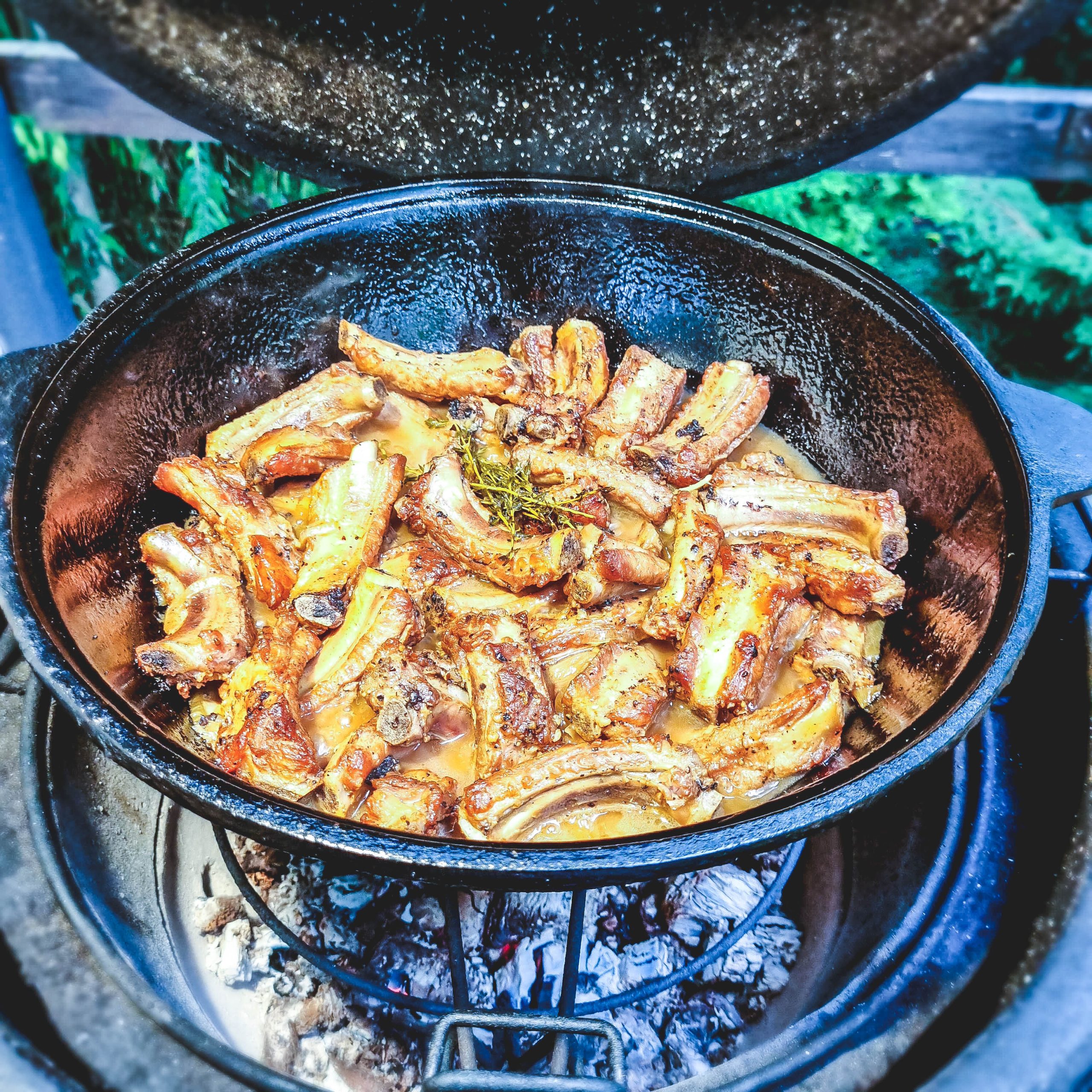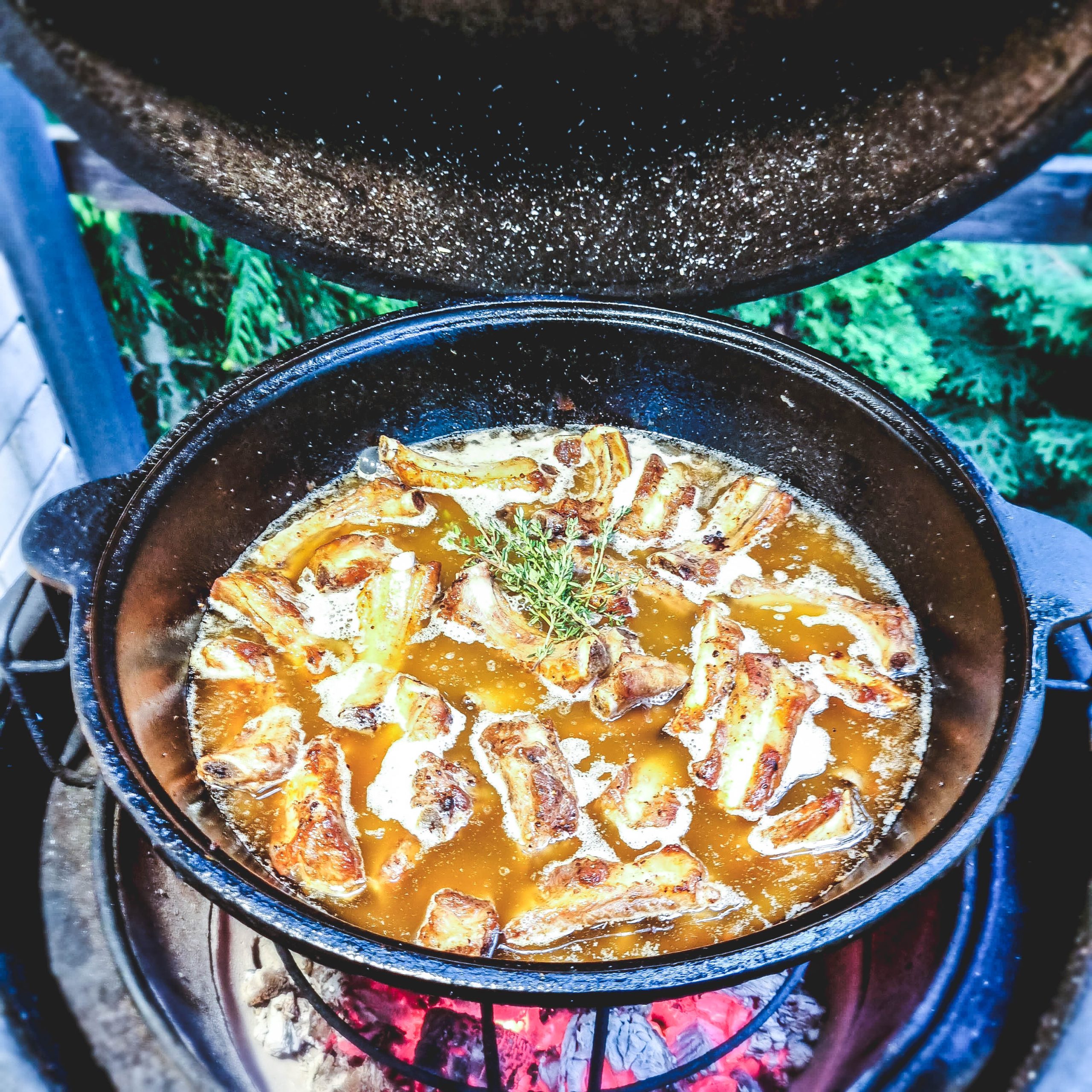 Supilam medų, alų. Dapilam vandens, kad nepilnai viską padengtų. Sudedam čiobrelio šakeles. Kazaną uždengiam. Kepsninę uždarom.