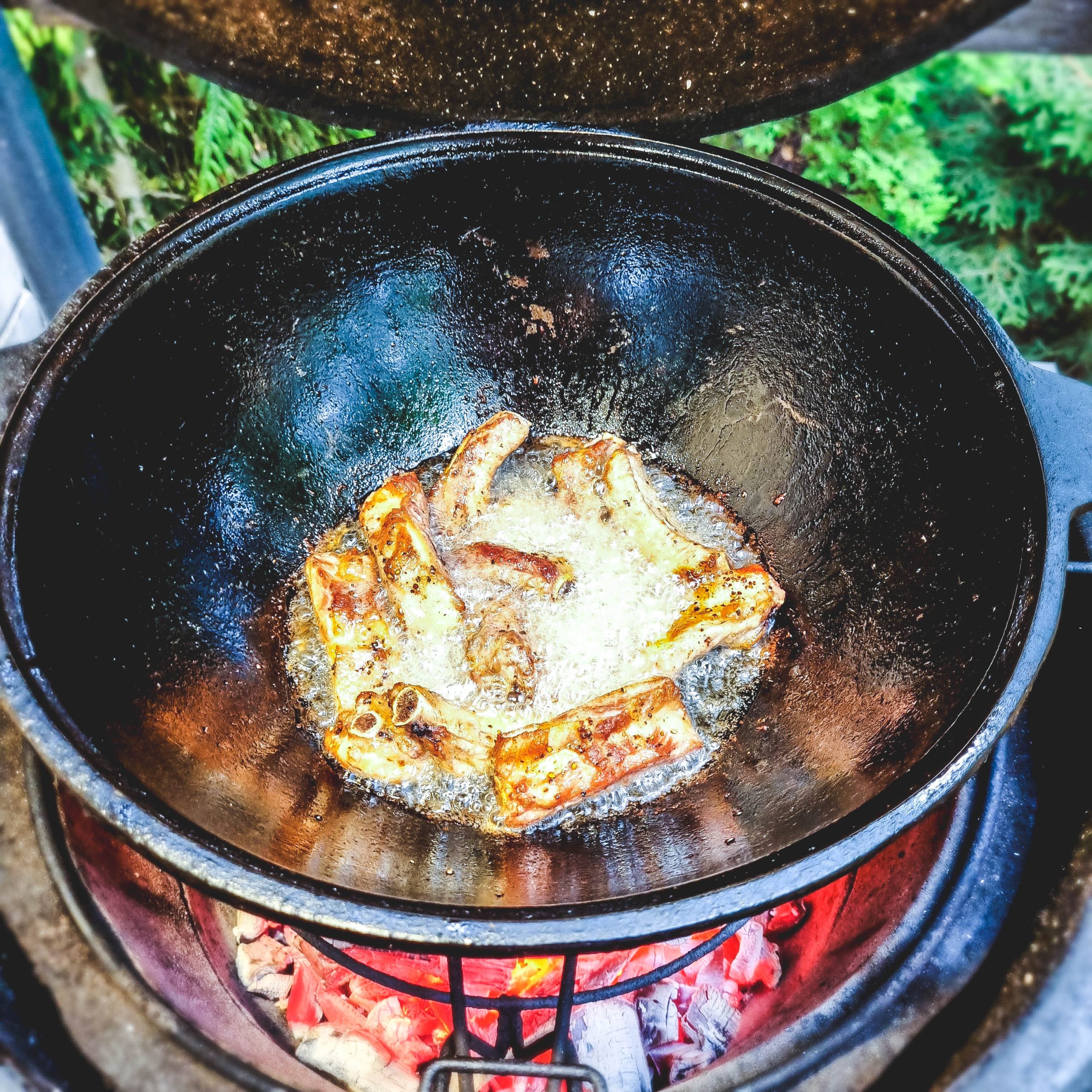 Dalimis, kad neatšaltų aliejus apkepam šonkaulius. Traukiam lauk ir atidedam į šalį.