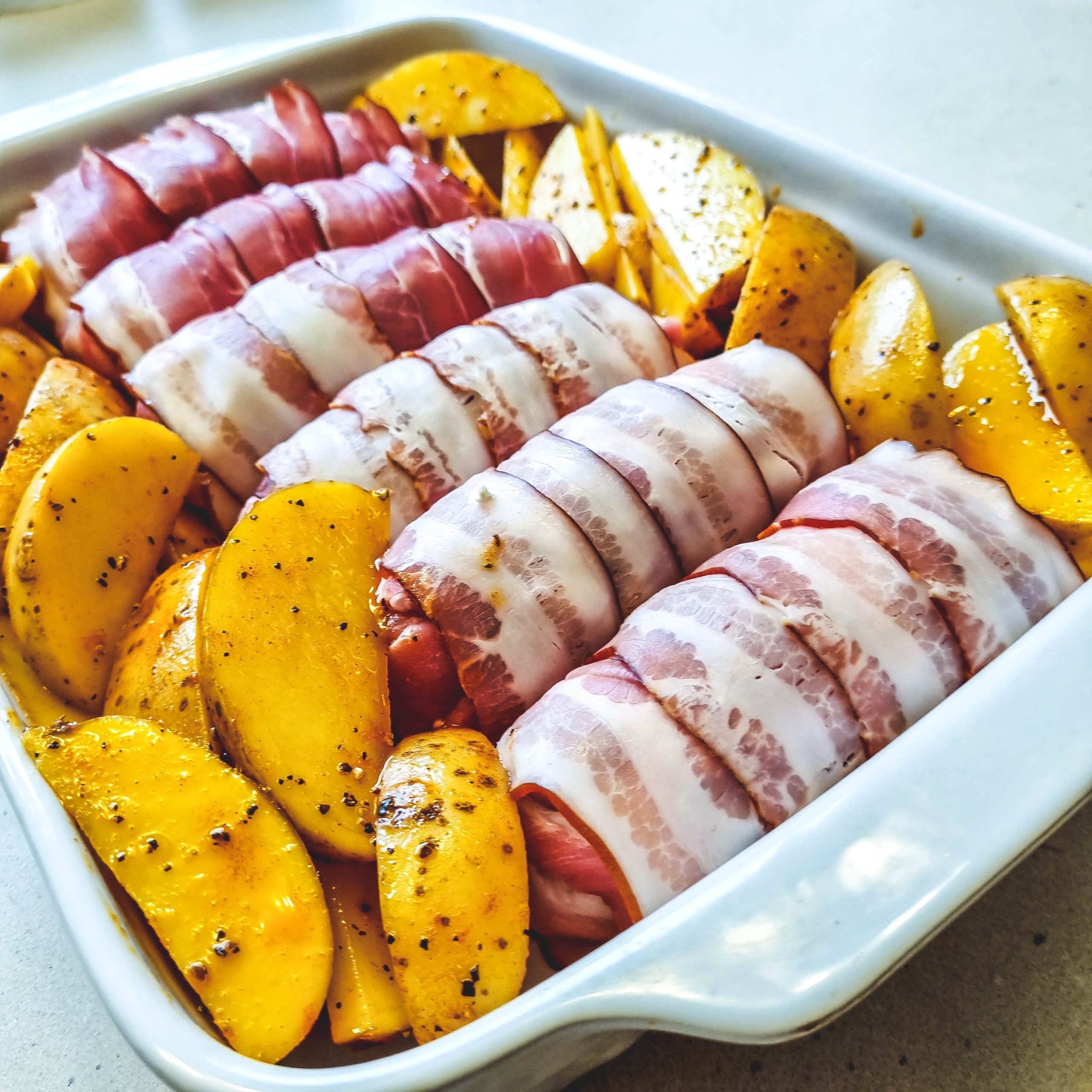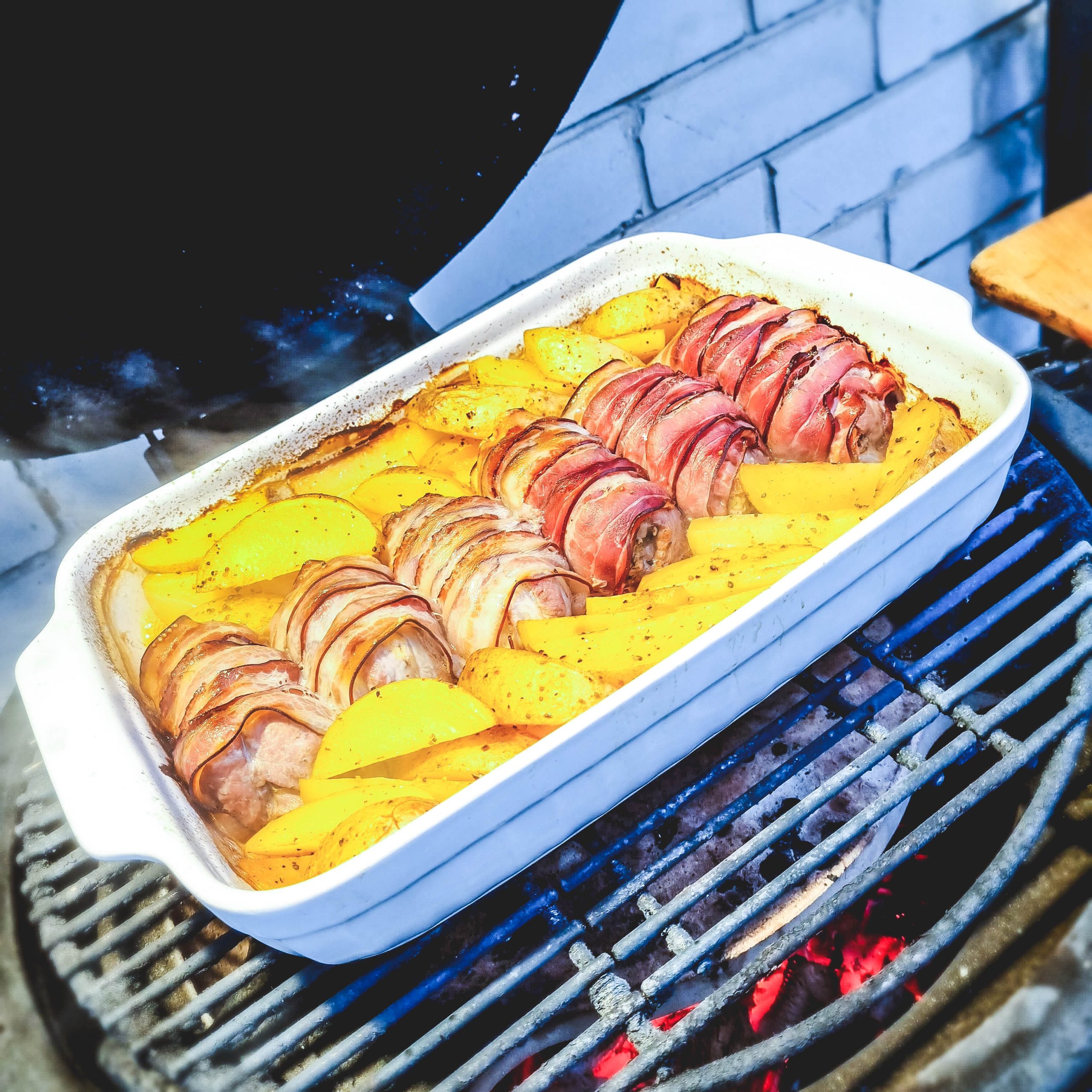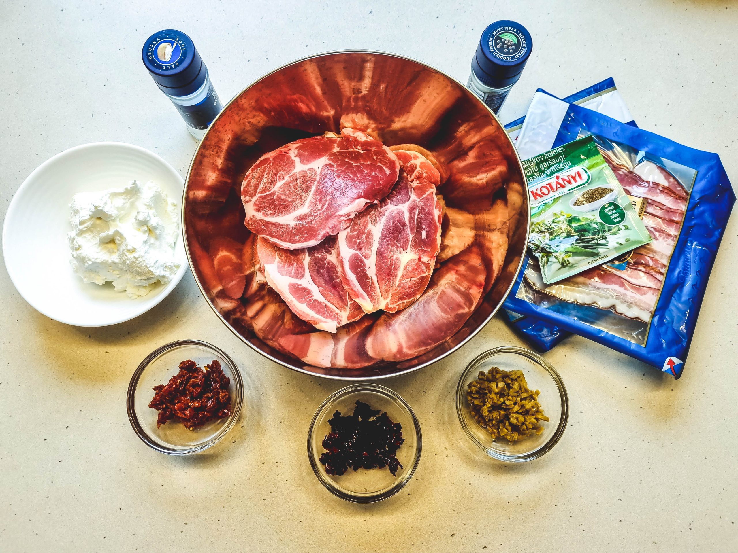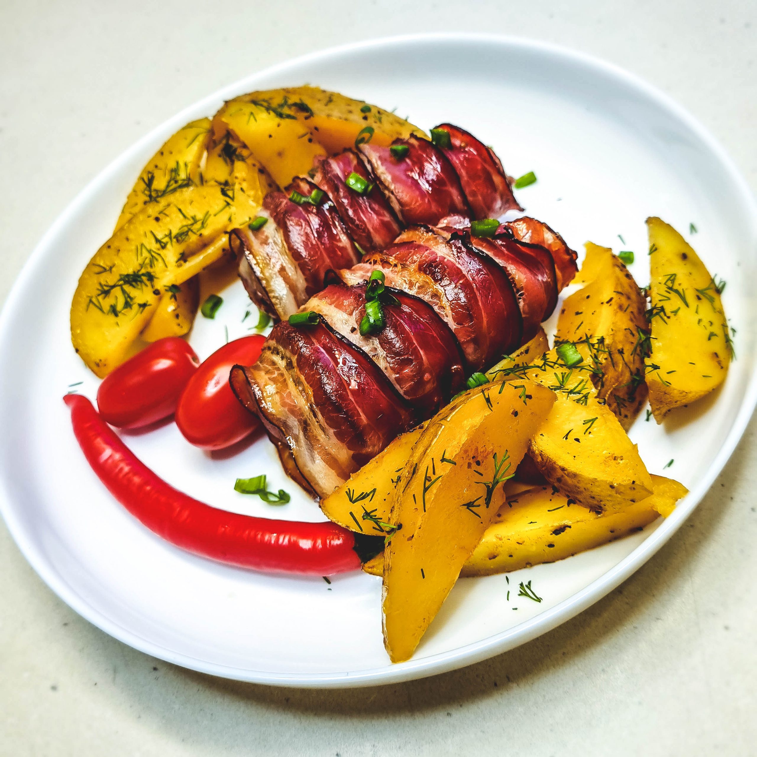 Kiaulienos Suktinukus Įdarytus Naminiu Varškės Kremo Įdaru ir Apsuktus Bekonu