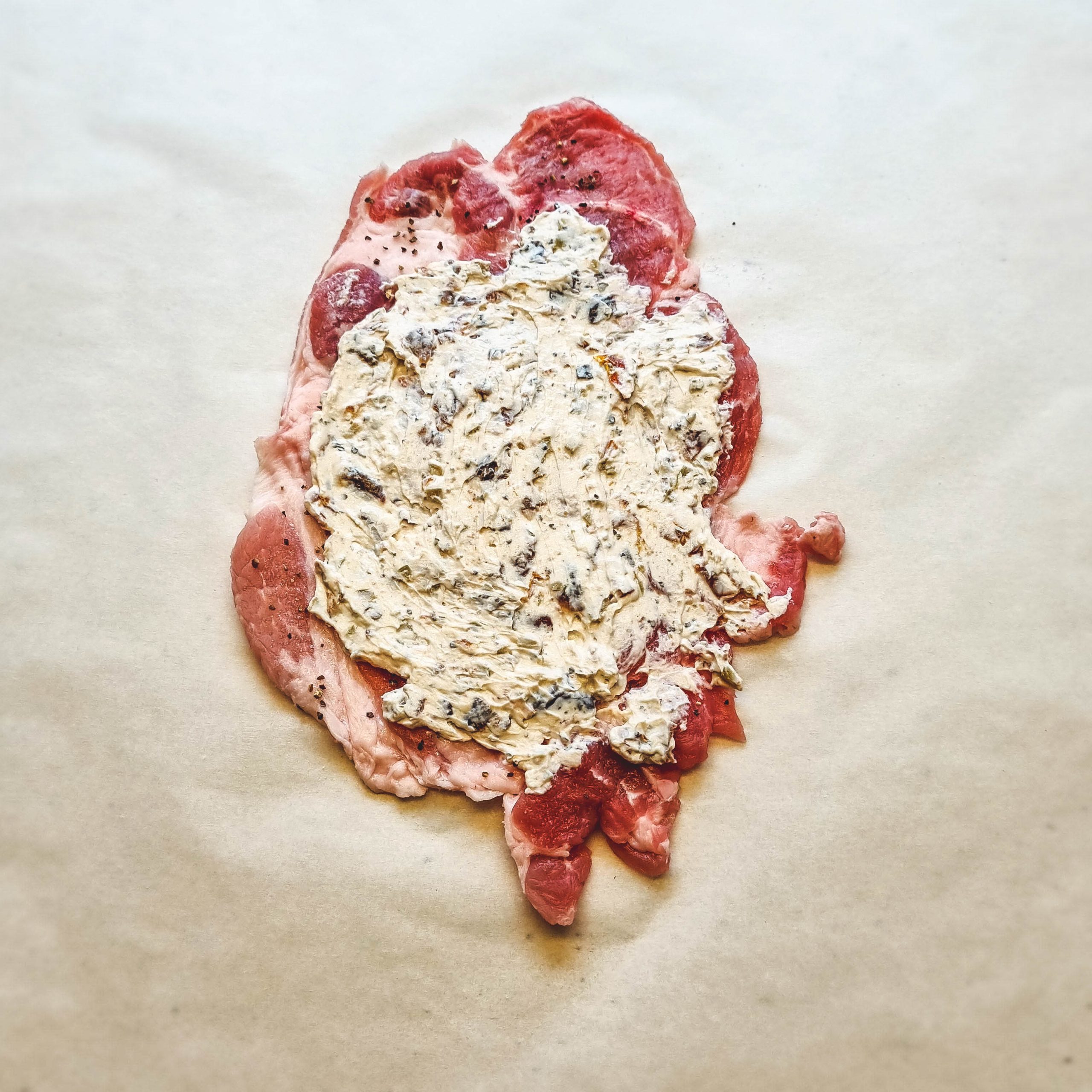 Mėsą supjaustom 1-2 cm. storio kepsniais. Kepsnius dedam tarp maišelių ir paploninam plokščiu mėsos plaktuku. Vytintus pomidorus, žalias alyvuoges ir džiovintas slyvas supjaustom smulkiai. Atitirpusį ir iš kefyro išsiskyrusį vandenį nuspaudžiam per marlę. Marlėje liks švelnus varškės kremas. Sudedam į indą. Pagardinam druska. Suberiam smulkiai pjaustytus vytintus pomidorus, alyvuoges ir slyvas. Pagardinam Itališkais prieskoniais. Išmaišom. Paragaujam ar ko netrūksta. Atidedam į šalį.
