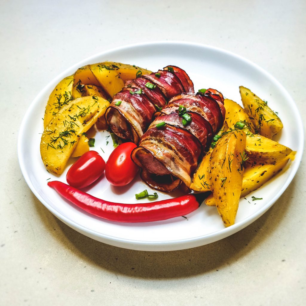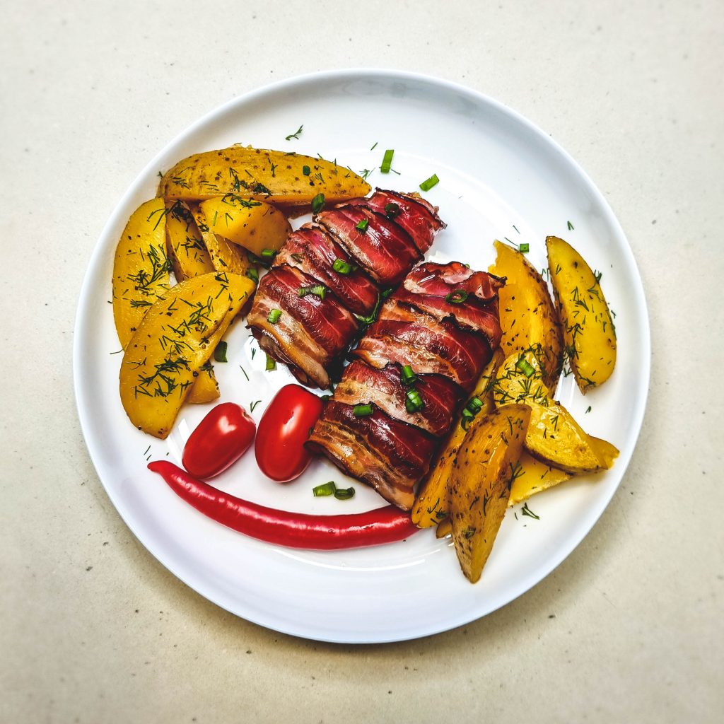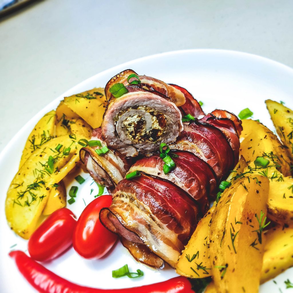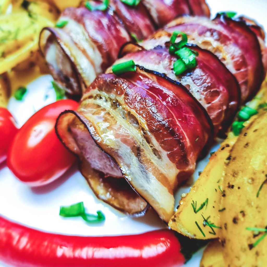 Kiaulienos Suktinukus Įdarytus Naminiu Varškės Kremo Įdaru ir Apsuktus Bekonu
