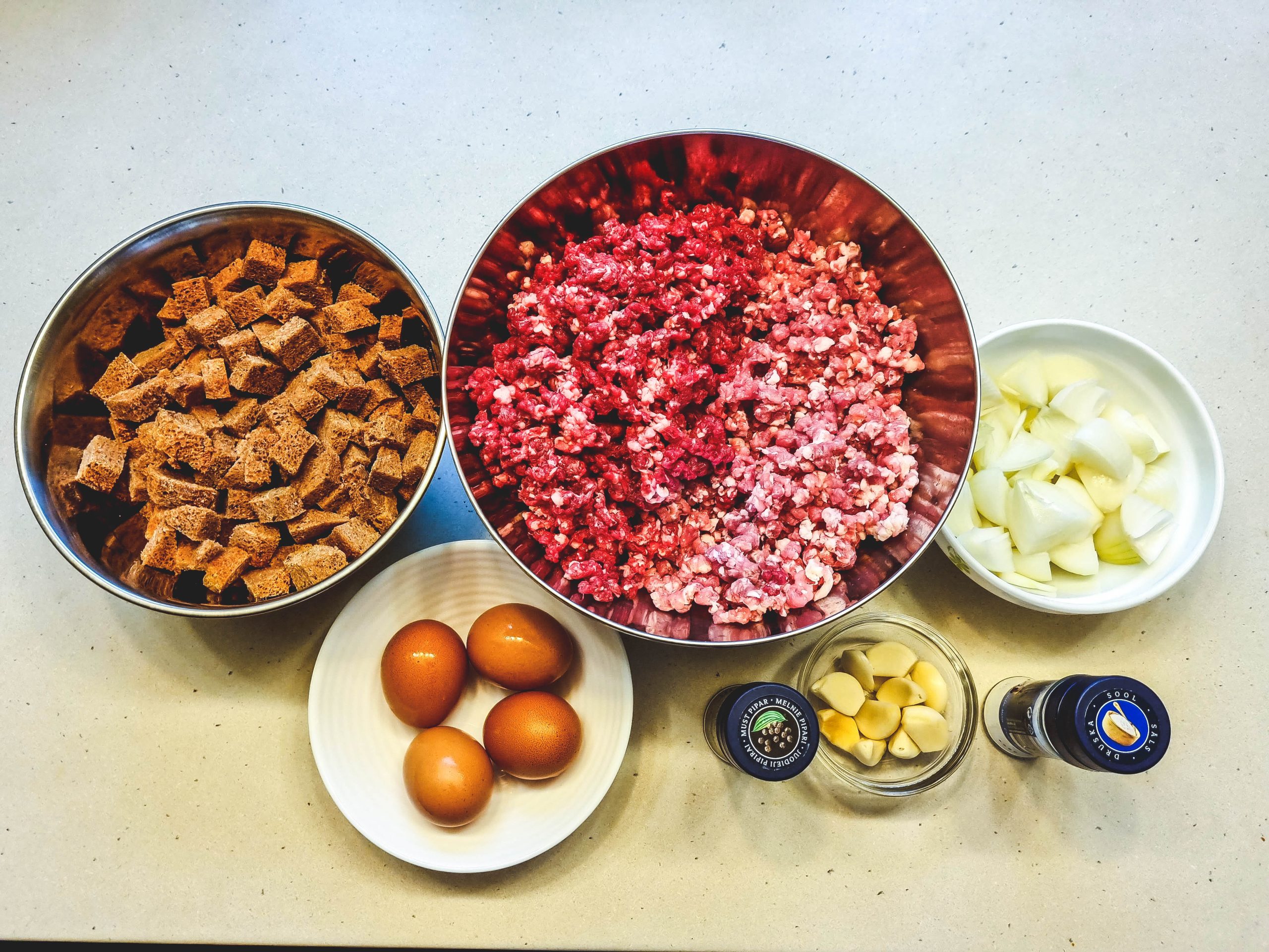 Mėsą sumalam. Nuo duonos nupjaustom plutą. Duoną supjaustom kubais. Sudedam į dubenį. Užpilam vandeniu. Išmaišom ir paliekam mirkti.
