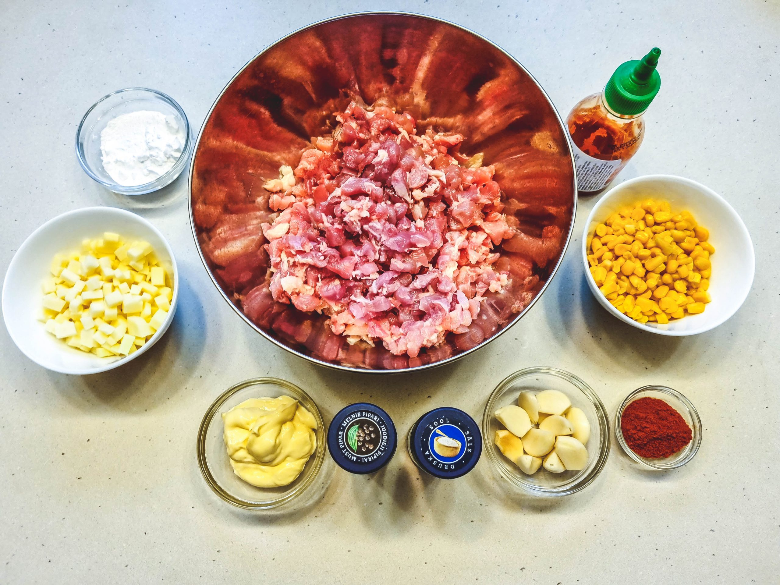 Suberiam konservuotus kukurūzus, krakmolą. Sudedam majonezą ir Sriracha padažą. Gerai viską išmaišom.