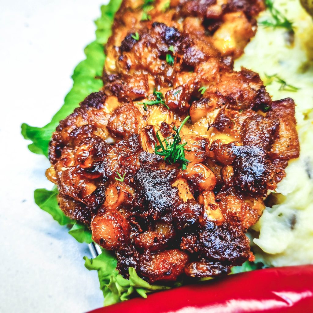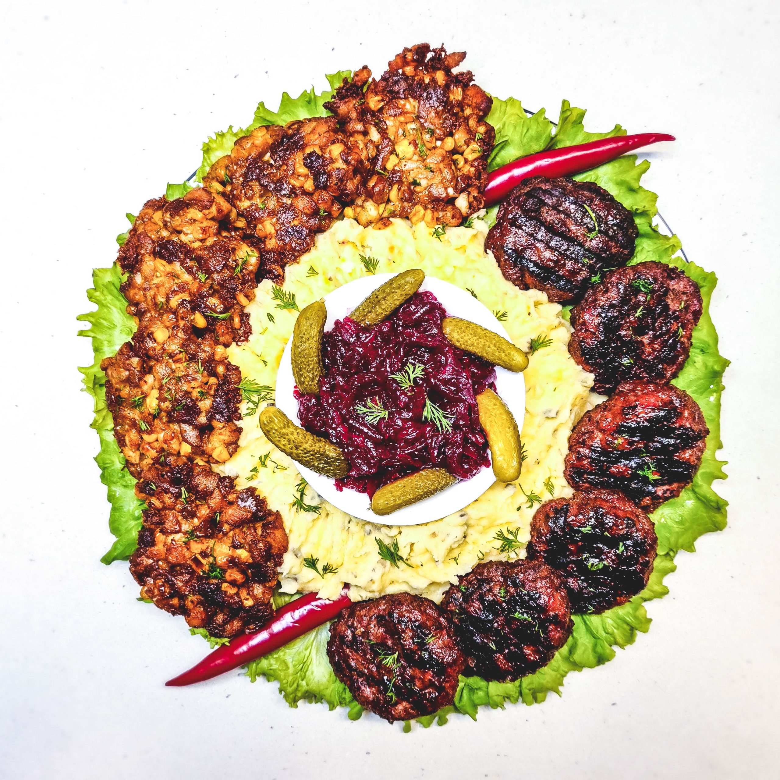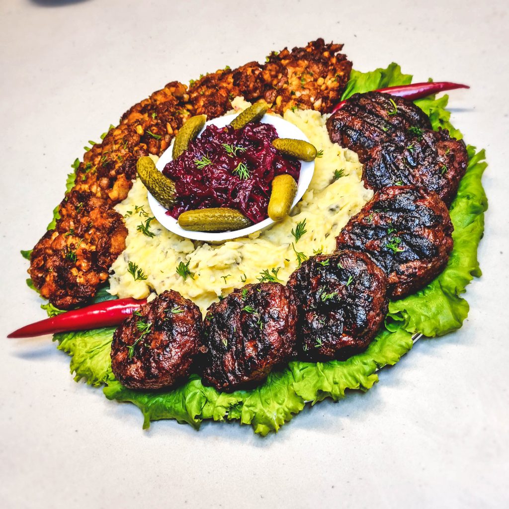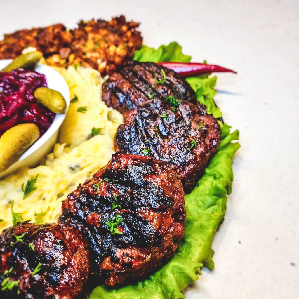 Pateikiam kotletukus su bulvių koše, burokėlių salotomis ir marinuotais agurkėliais 🤤