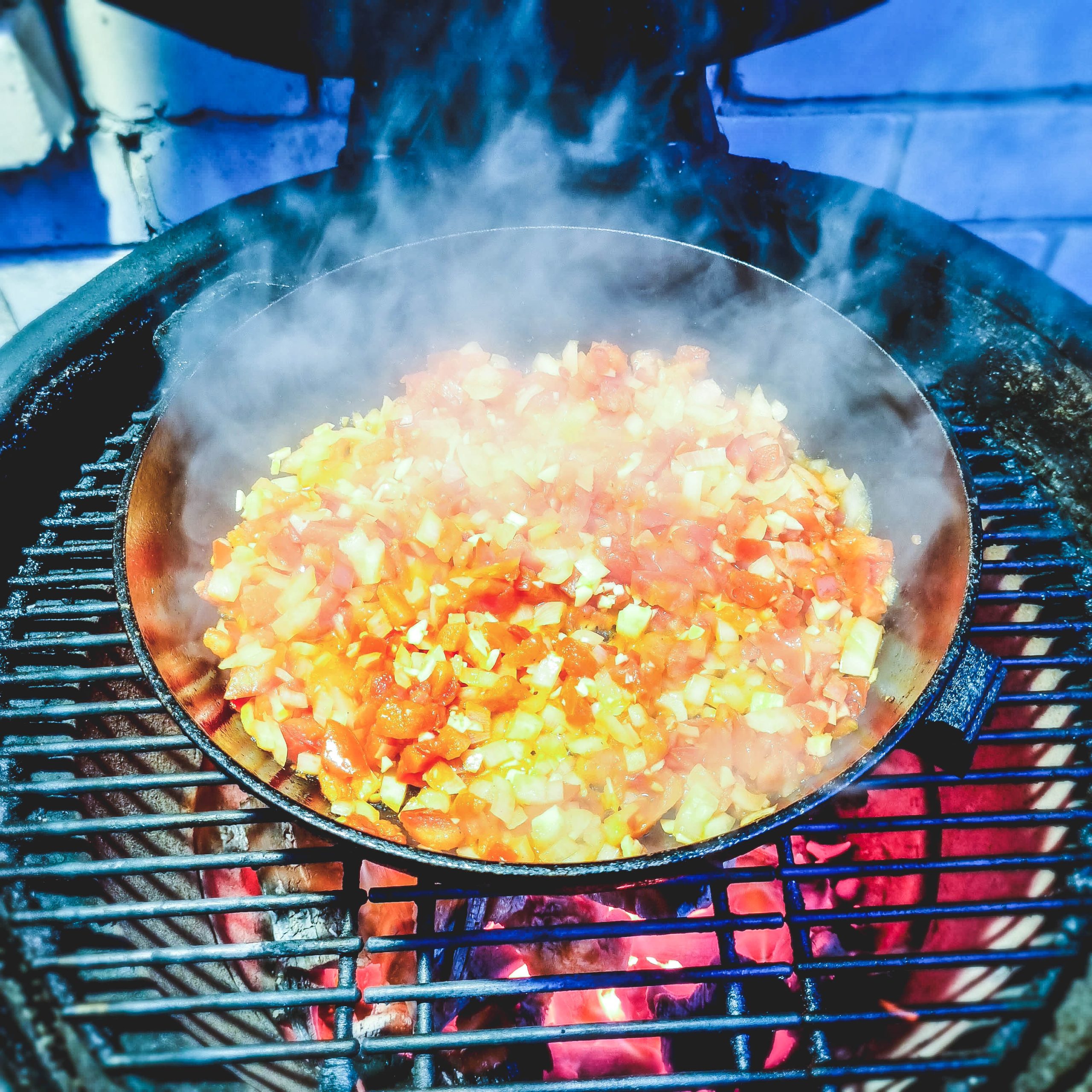 Į kepsninę įstatom ketaus keptuvę. Įpilam truputį aliejaus. Suberiam smulkiai pjaustytus svogūnus ir pomidorus. Pamaišydami 5 min. apkepam kol suminkštės. Suberiam česnakus. Keletą minučių pamaišydami apkepam. Traukiam lauk.
