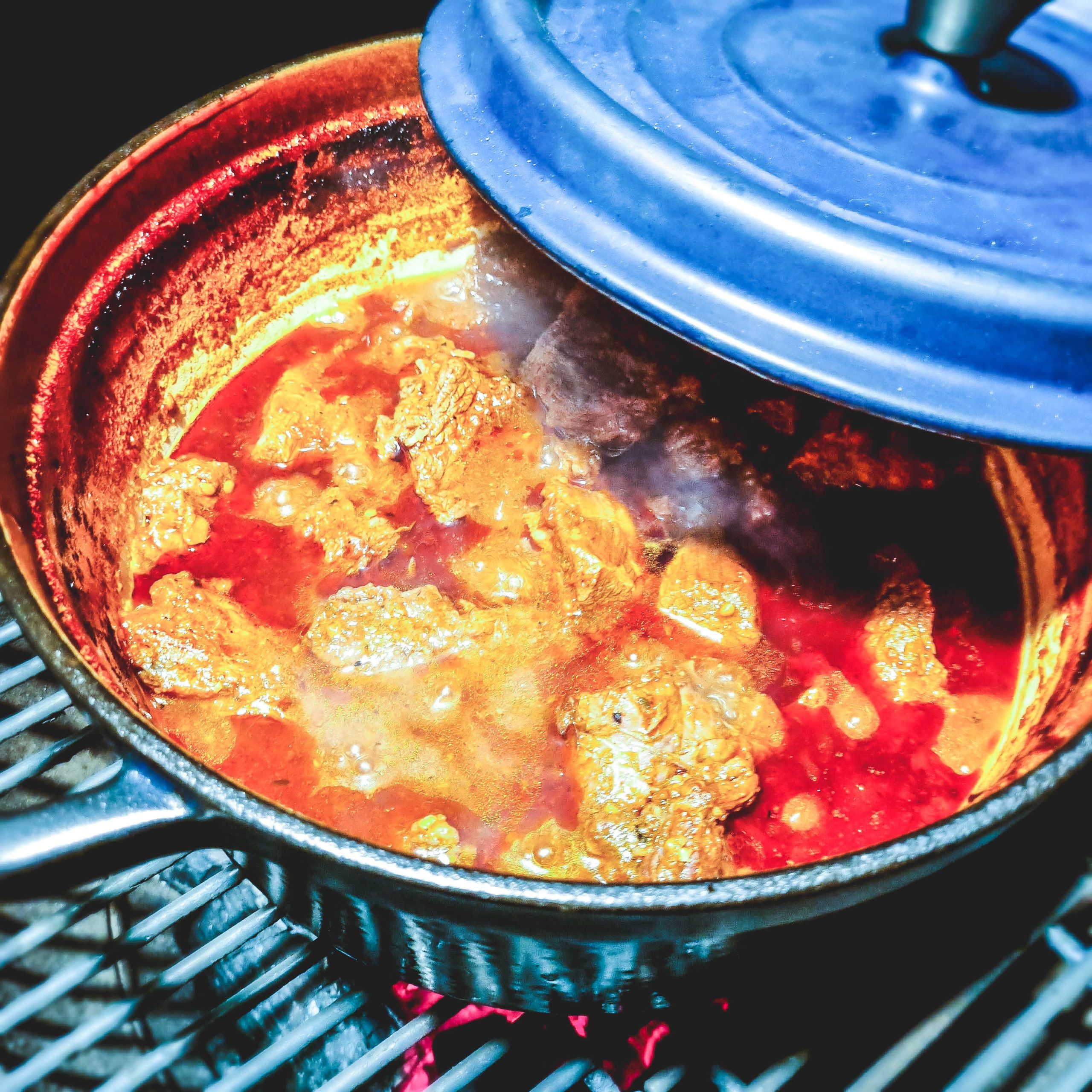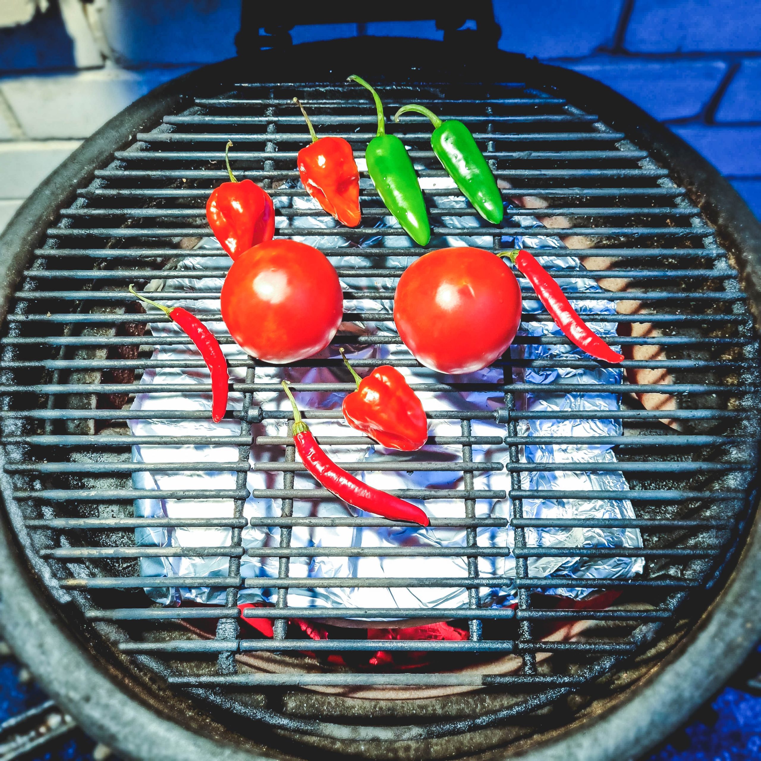 Pasiruošiam marinatą-padažą: Svogūnus, 3 pomidorus ir česnakus supjaustom smulkiai. Mėsą supjaustom gabalais. Kepsninę paruošiame netiesioginiam kepimui 200-210C temperatūroje. Sudedam čili pipirus, į kompanija porą didelių pomidorų. Kepam 15-20 min. Kol paskrus. Traukiam lauk ir atidedam į šalį.