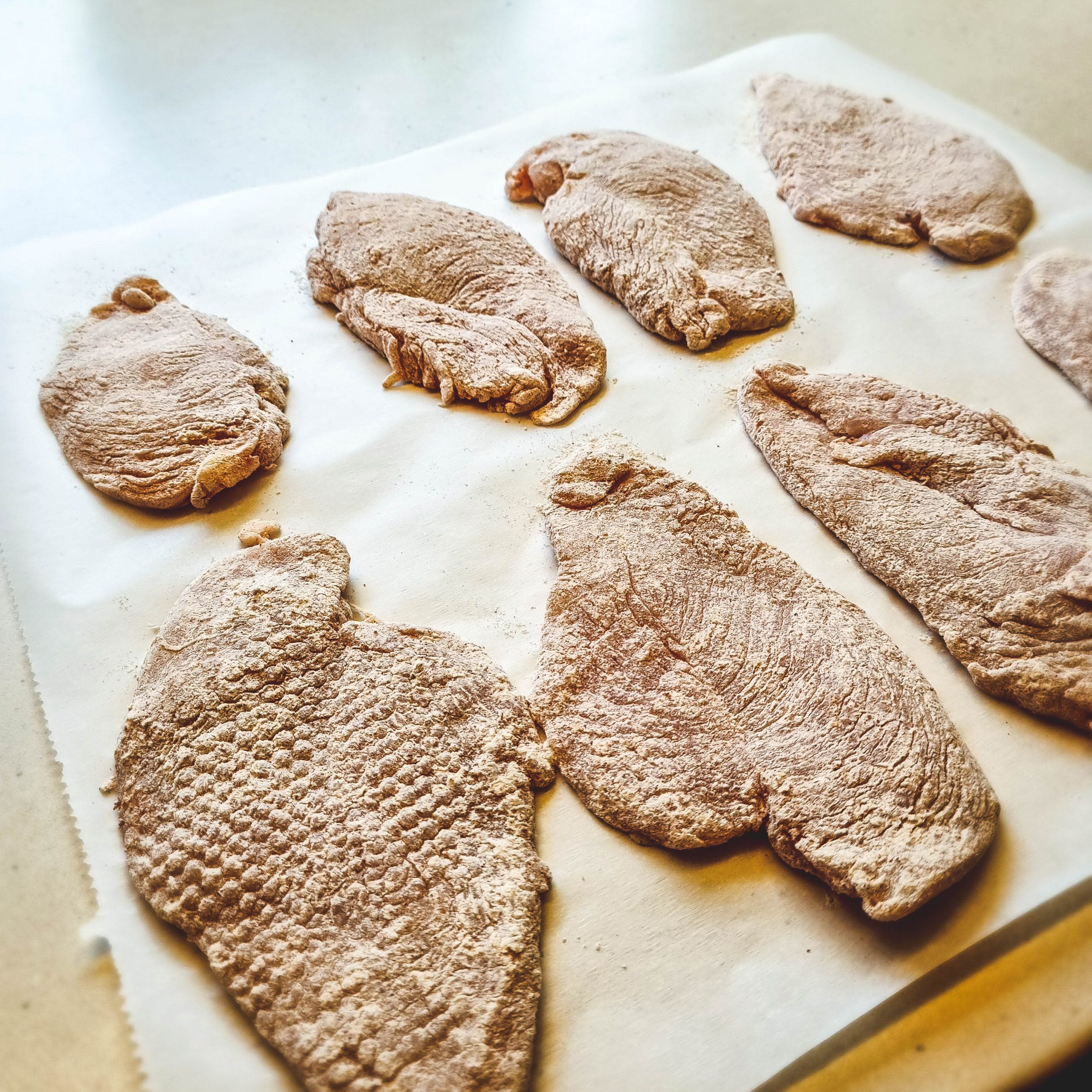 3. Dideliam inde sumaišom miltus su vištienos prieskoniais. Apvoliojam mišinyje vištienos kepsnelius. Nupurtom miltų perteklių ir kepsnelius atidedam į šalį.