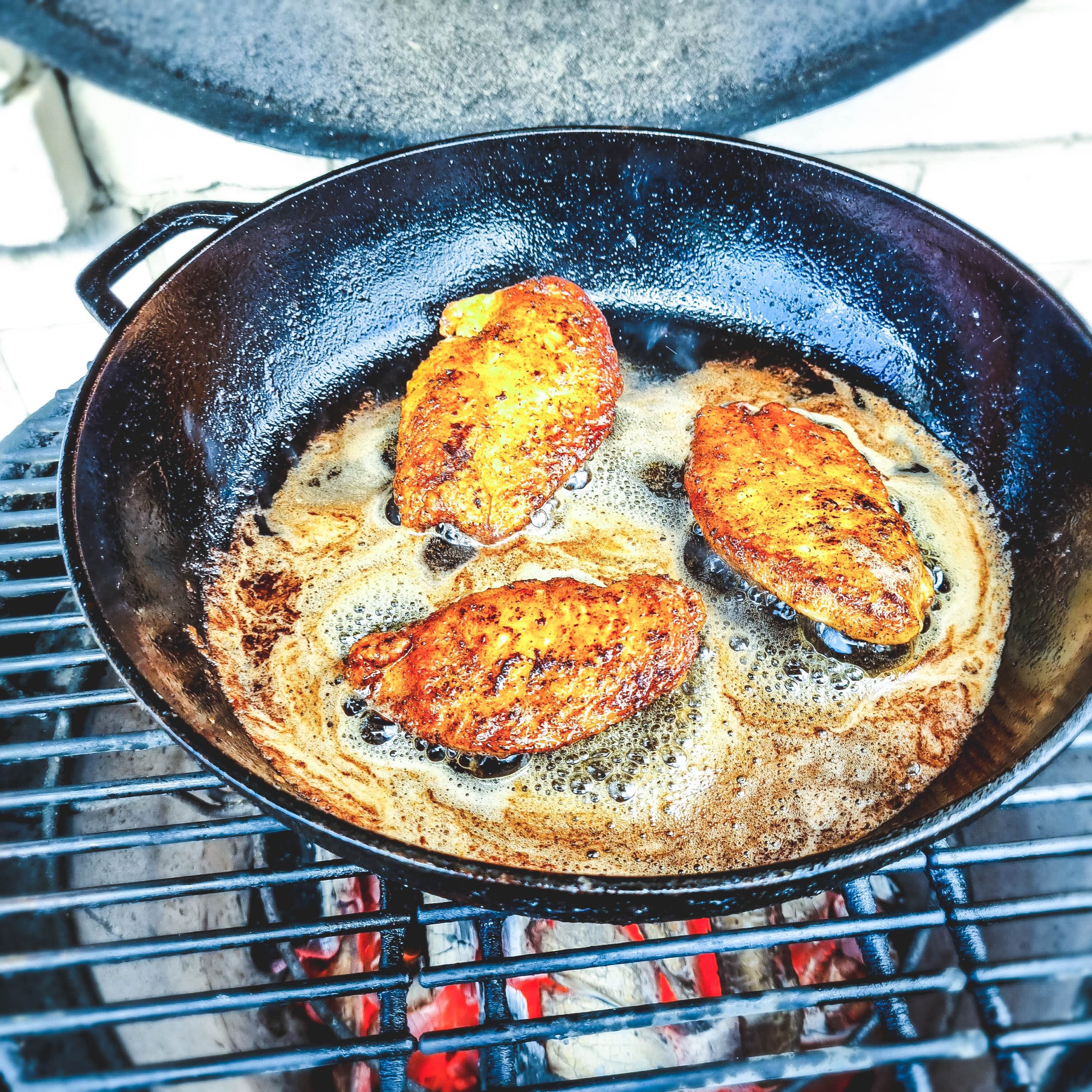 5. Įstatom ketaus keptuvę. Įpilam truputį aliejaus. Įdedam ir ištirpdom sviestą. Iš abiejų pusių po 4-5 min. apkepam vištienos kepsnelius kol parus ir iki vidinės 74C temperatūros. Traukiam lauk ir atidedam į šalį šiltai.