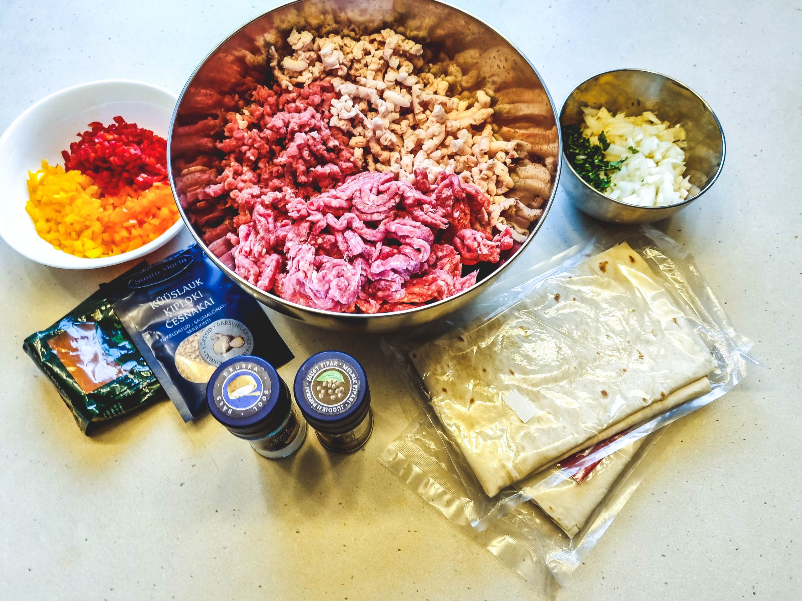 Mėsą sumalam. Svogūnus, paprikas ir šv. kalendras supjaustom smulkiai. Viską sumaišom su prieskoniais.