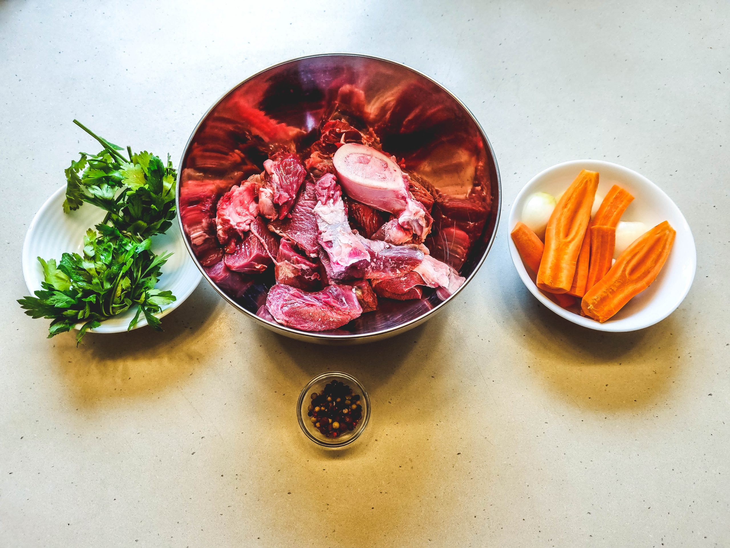 1. Išsiverdam sultinį: Morką perpjaunam per pusė išilgai. Svogūnus ir česnakų galvą perpjaunam per pusę. Mėsą pasmulkinam.