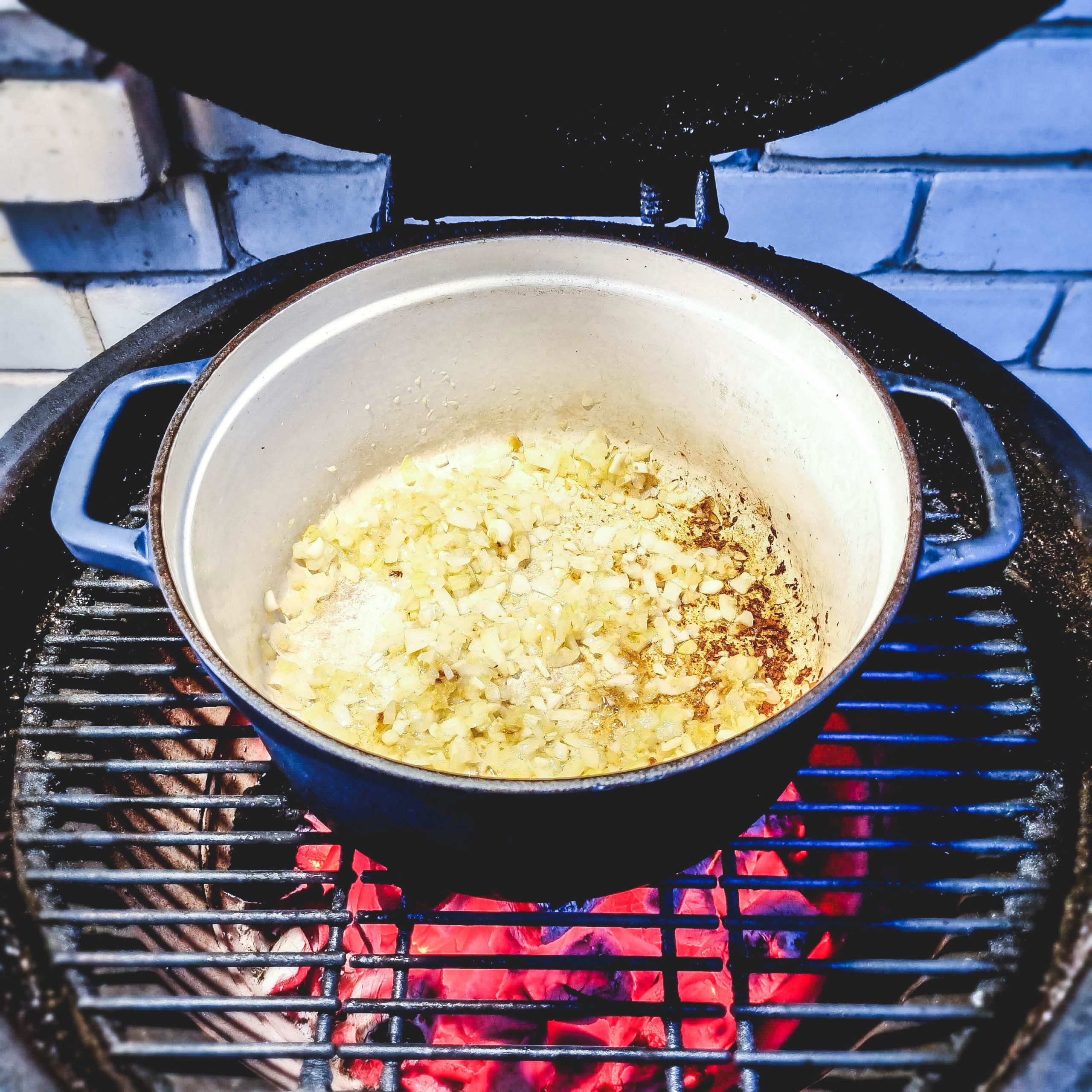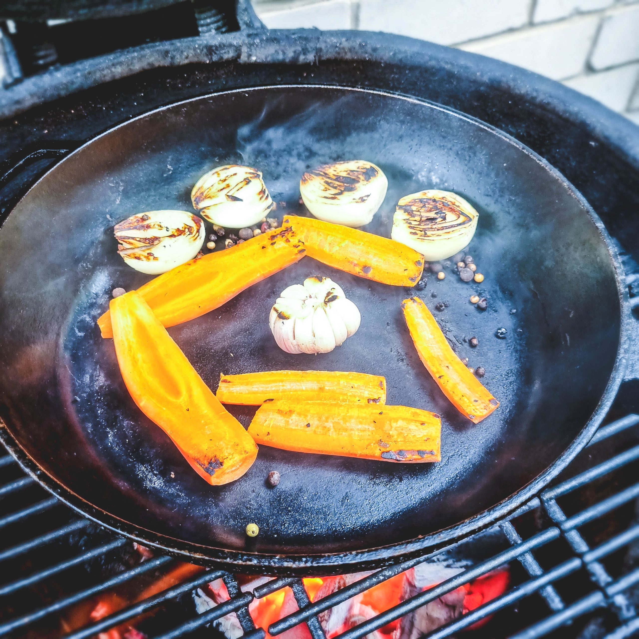 2. Kepsninę paruošiame tiesioginiam kepimui. Įstatom ketaus keptuvę. Sausai, be aliejaus, sudedam morkų, svogūnų ir česnako galvos puseles, suberiam pipirų žirnelius. Sausai pakepinam, kad morkos, česnako ir svogūnų puselės padegtų. Traukiam lauk.