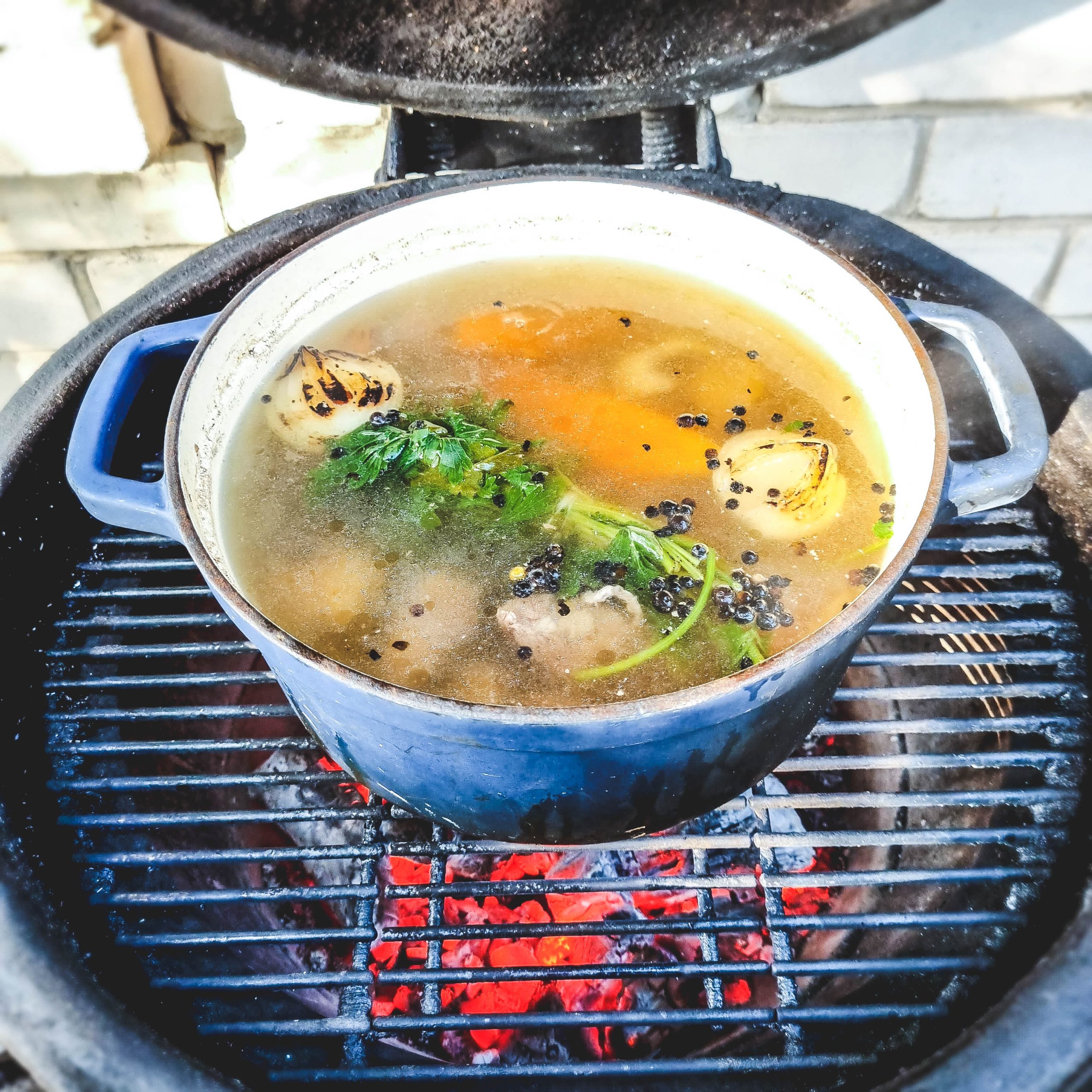 3. Įstatom Grand feu ketaus puodą, sudedam jautieną, pakeptas morkas, svogūnus, česnako galvą. Užpilam vandeniu. Užverdam. Kol vanduo užvirs, pirmas 10-20 min. sąžiningai nugriebiam putas, kad sultinys būtų skaidrius. Kai putos jau nebekils suberiam pakepintus pipirų žirnelius. Puodą uždarom. Kepsninę uždarom. Oro sklendes paliekam praviras minimaliai. Verdam 2-3 val. Tarpe patikrinam. Jei reikia dar dapilam vandens ar nugriebiam putas.