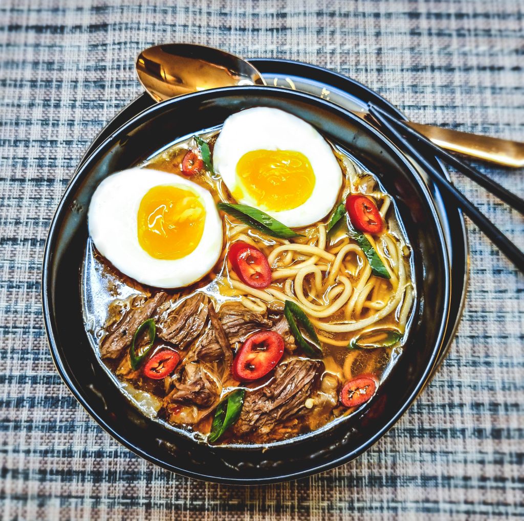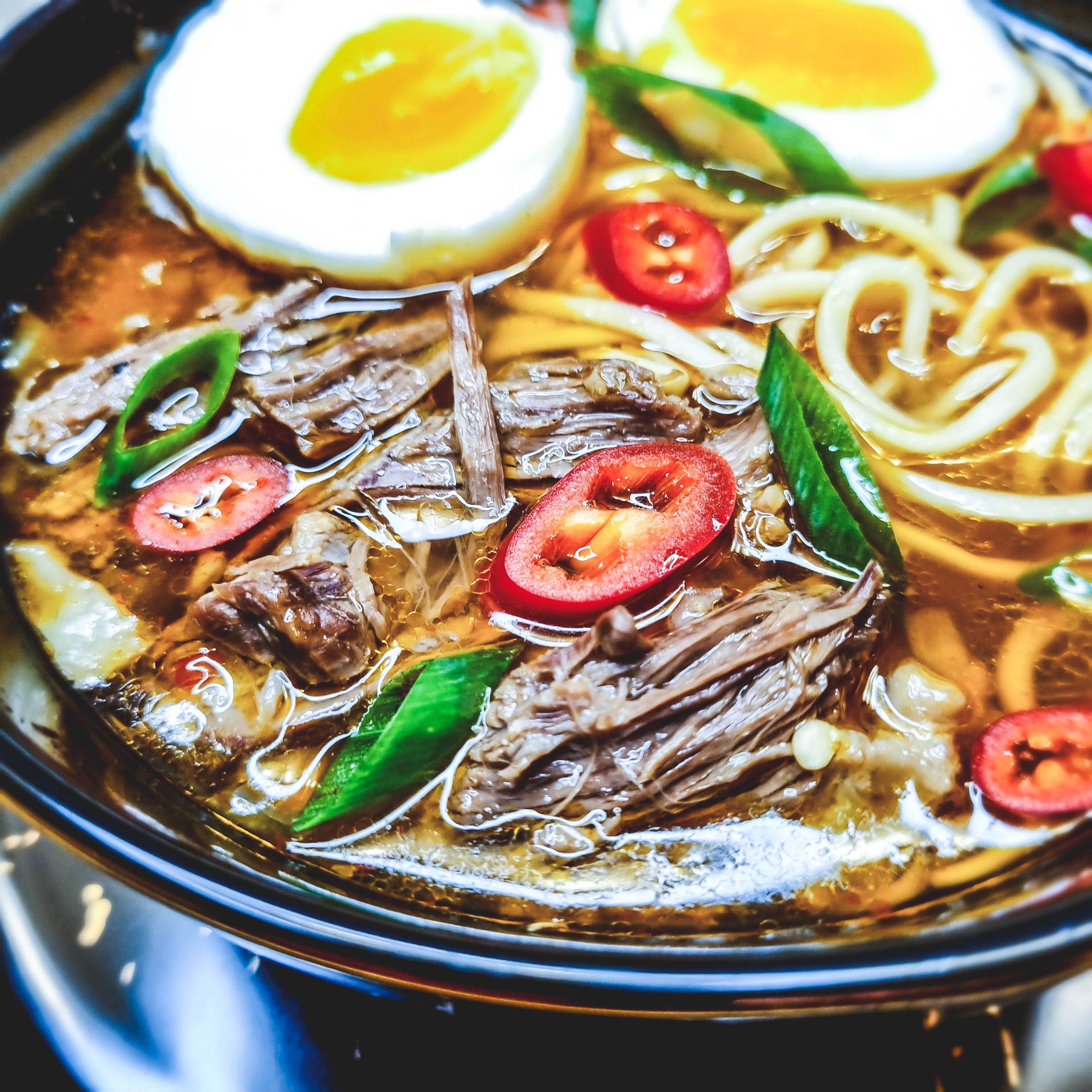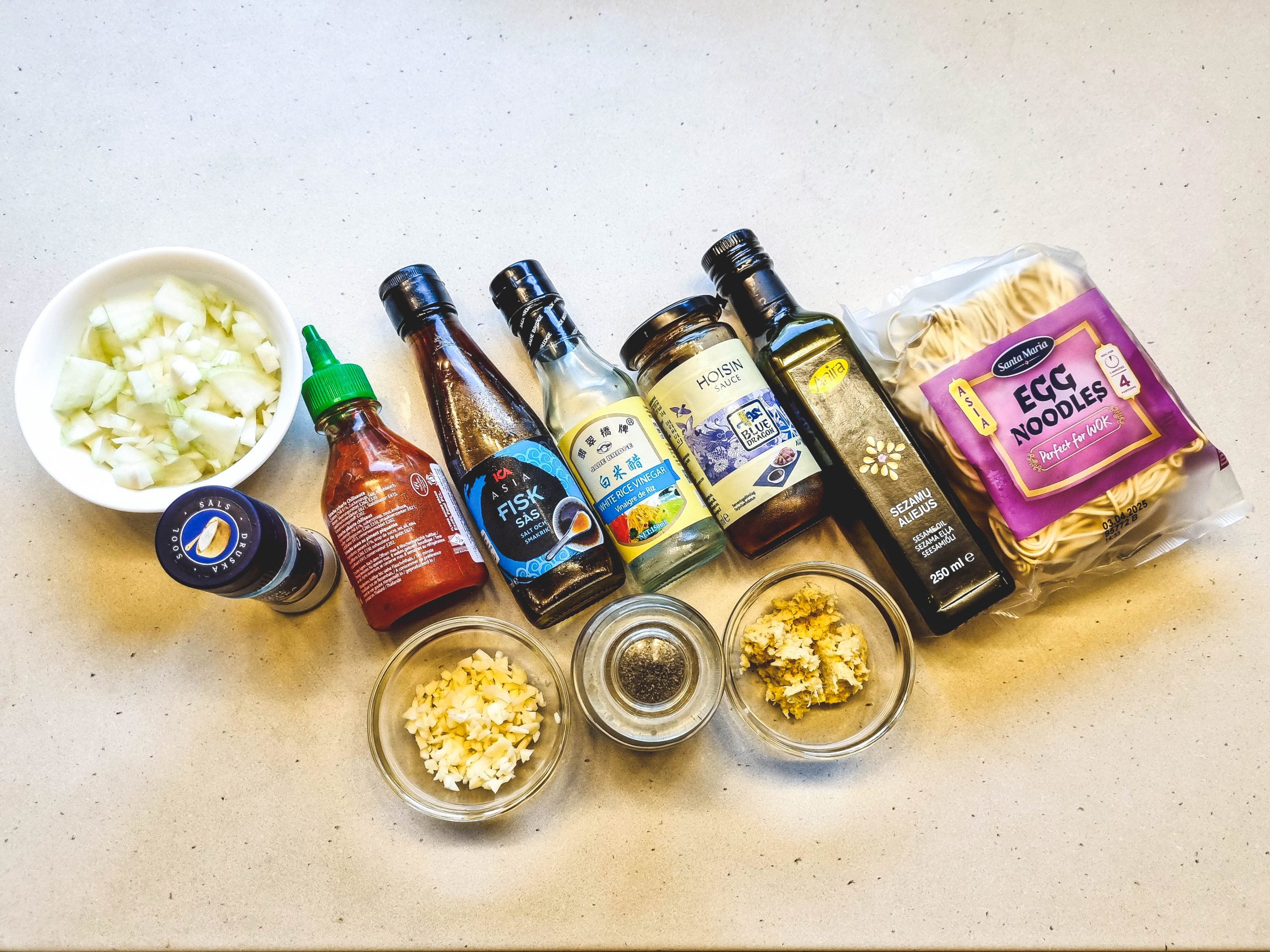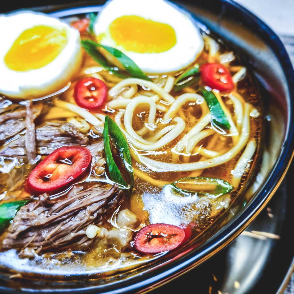 7. Supilam pasiruoštą sultinį. Suberiam mėsą. Išmaišom. Palaukiam kol pradės burbuliuoti. Supilam Hoisin padažą, ryžių actą, žuvų padažą, sezamo aliejų, saldžiaaštrį padažą, pagardinam druska ir pipirais. Pagal norimą aštrumą įpilam Sriracha padažo. Išmaišom. Pamaišydami paverdam dar 10-20 min. Paragaujam ar ko netrūksta.Sudedam makaronus. Pamaišydami verdam kol makaronai išvirs. Paragaujam ar ko netrūksta. Traukiam lauk.