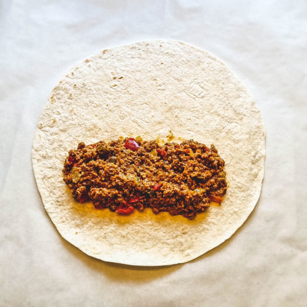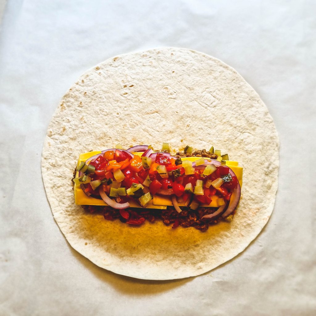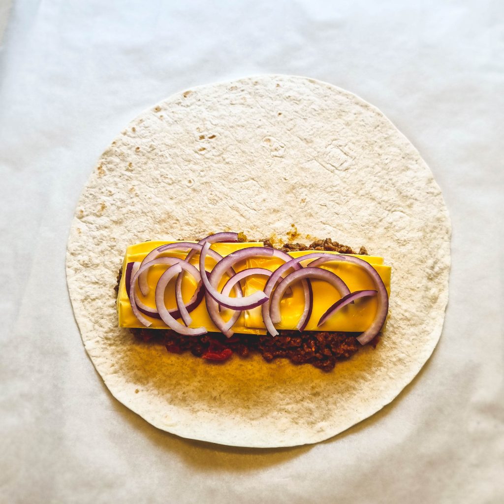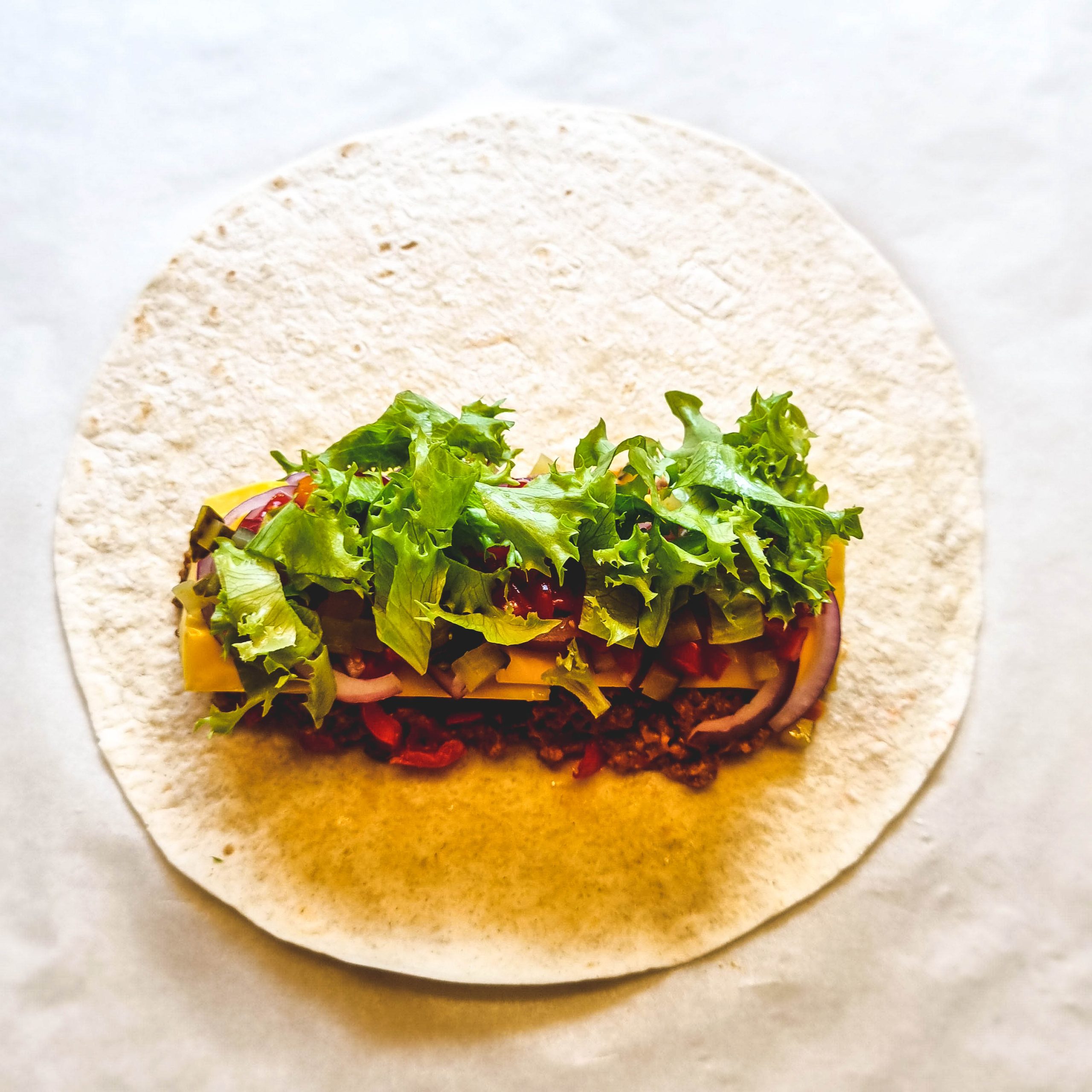 Kol kaista kepsninė paruošiame buritas: Ant tortilijos išdedam mėsos įdaro takelį. Ant viršaus išdėliojam Čederio sūrį, pomidoriukų kubelius, salotas. Užlenkiam tortilijos galus ir susukam į suktinuką.
