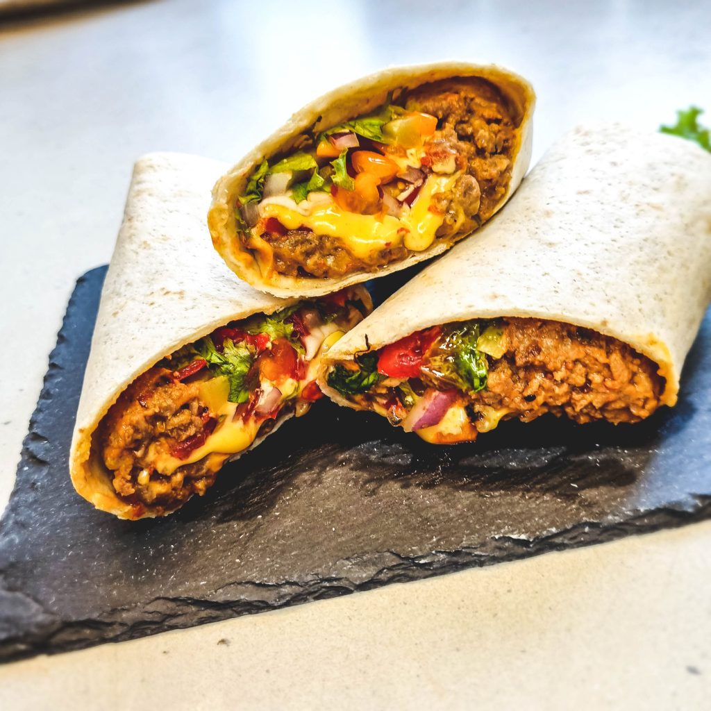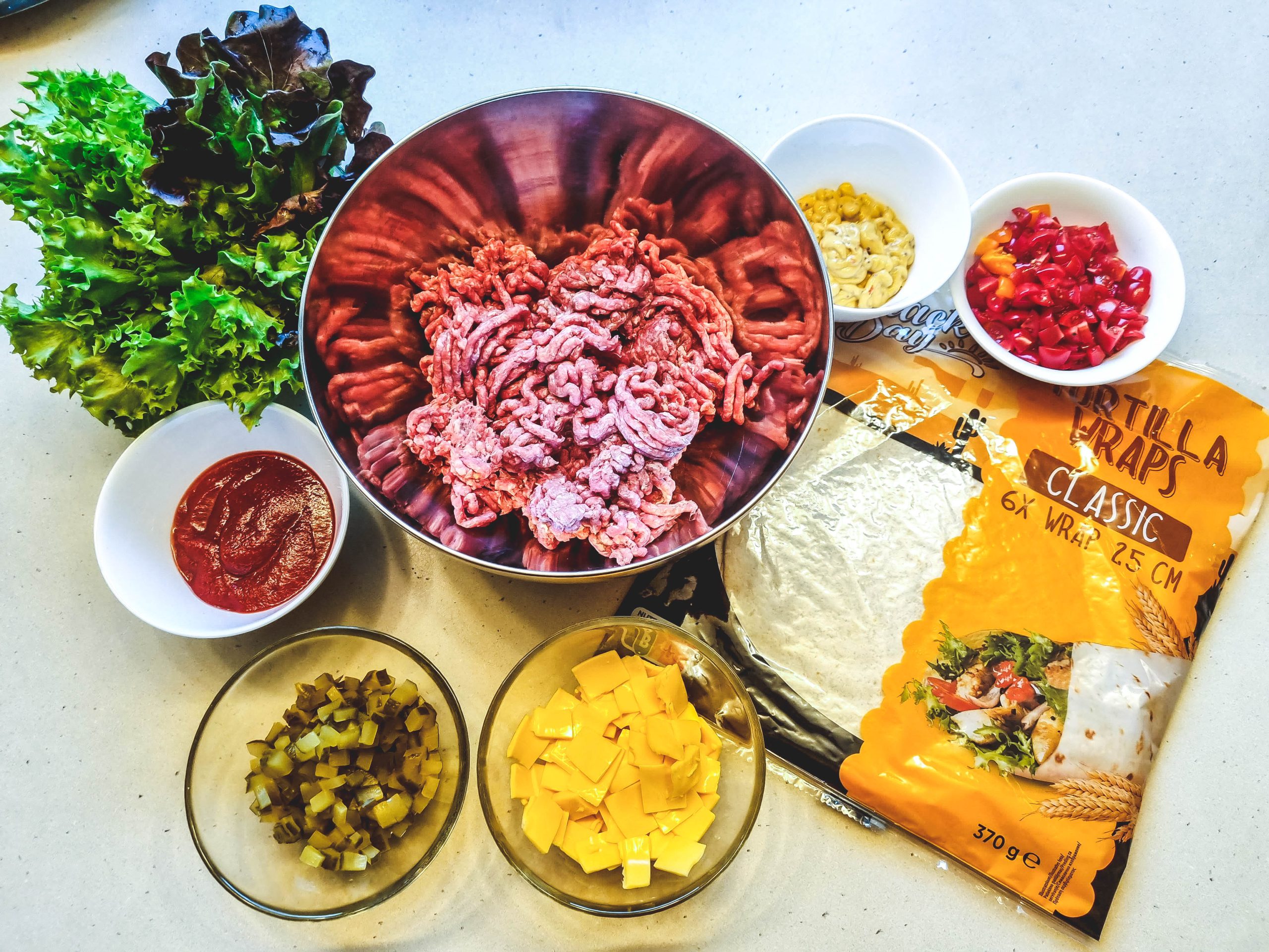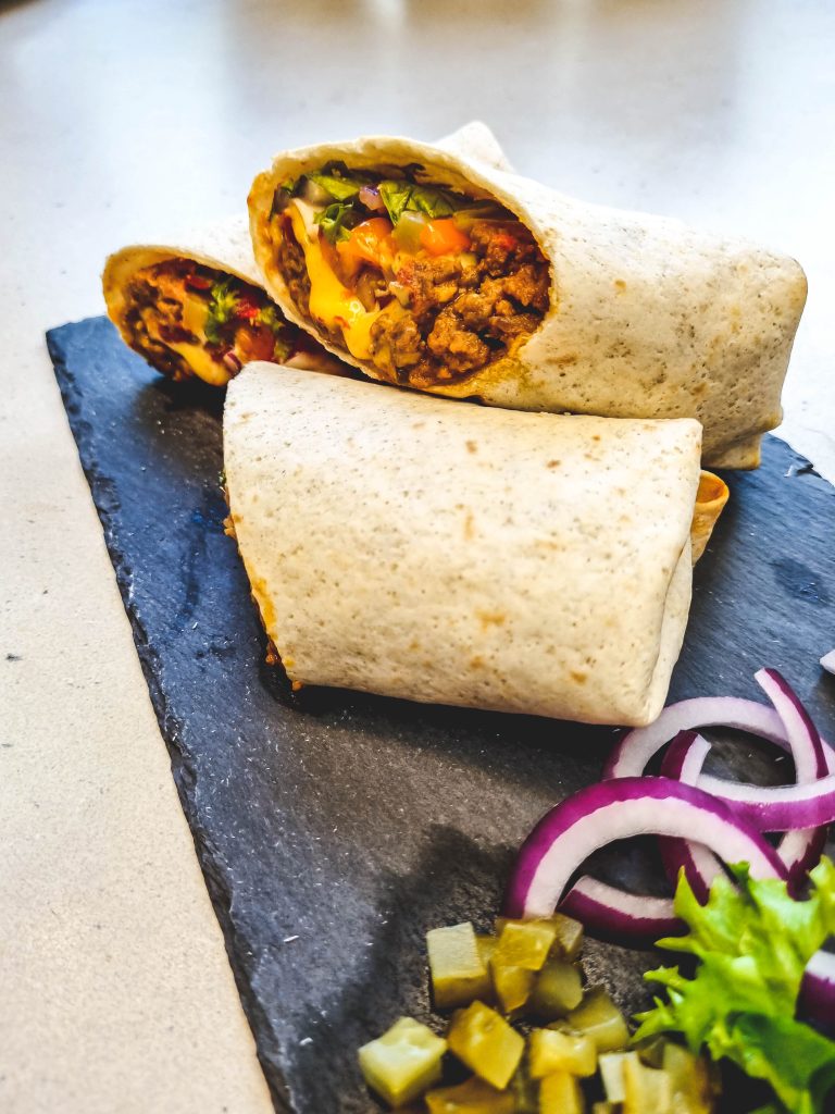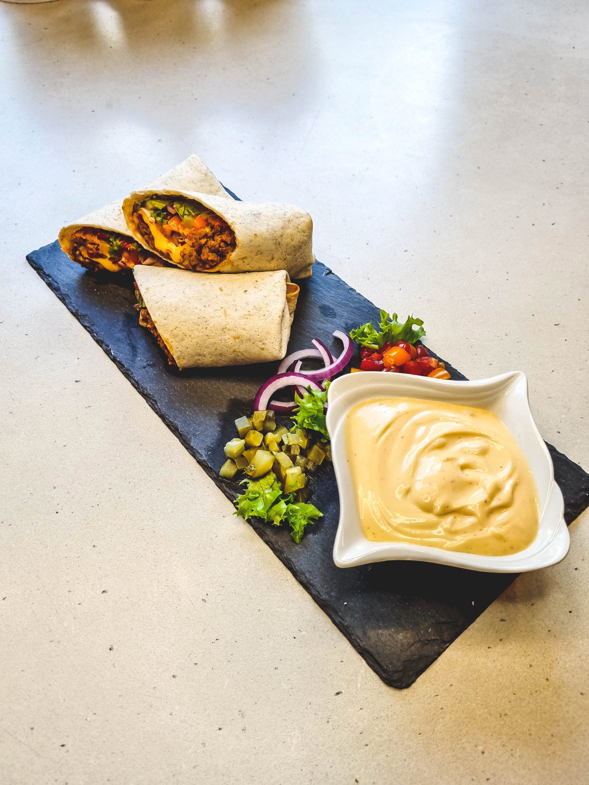 Kol kaista kepsninė paruošiame buritas: Ant tortilijos išdedam mėsos įdaro takelį. Ant viršaus išdėliojam Čederio sūrį, pomidoriukų kubelius, salotas. Užlenkiam tortilijos galus ir susukam į suktinuką.