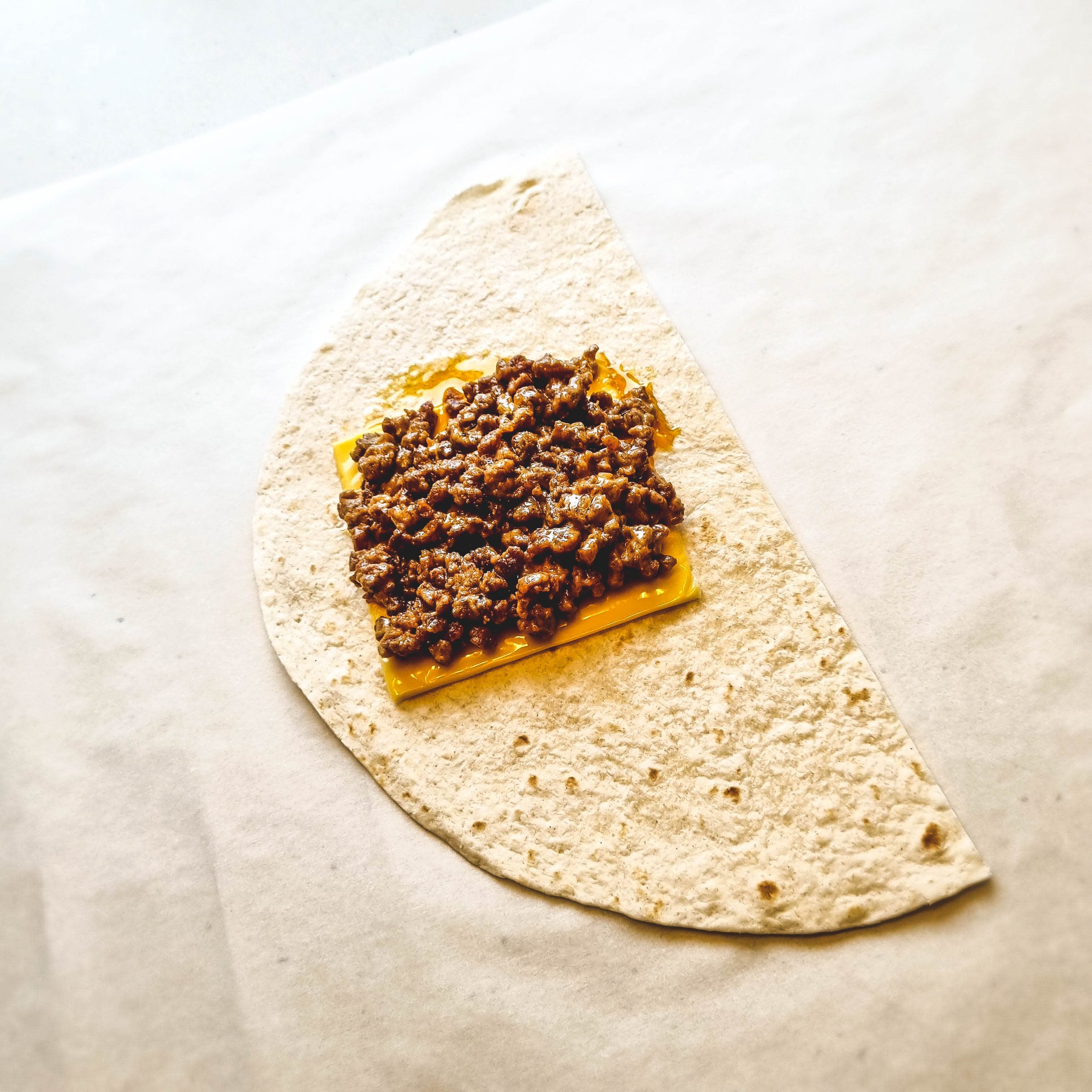 Tortilijas perpjaunam per pusę. Ant pusės ketvirčio dedam Čederio lapelį. Ant viršaus porciją mėsos.