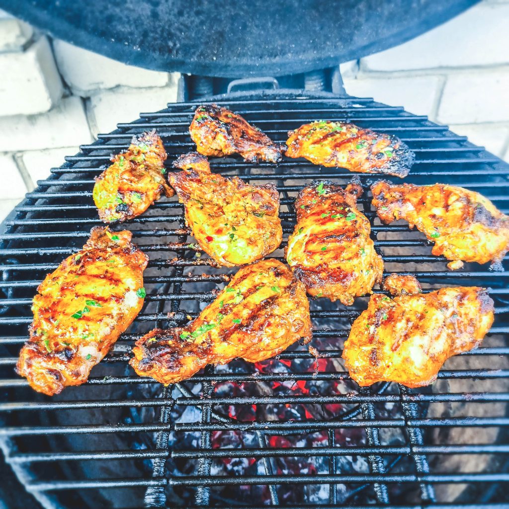 Prieš galą mėsos gabaliukus iš abiejų pusių aptepam tirpdytu sviestu su kalendra.
