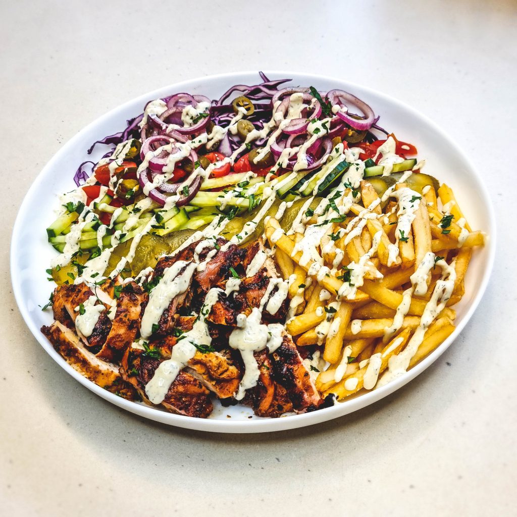 Traukiam lauk. Supjaustom ir pateikiam su bulvytėm-fri, marinuotais jelapenais ir agurkėliais, mėlyngūžiu kopūstu, pomidoriukais, marinuotu raudonuoju svogūnu, čili pipirais 🥰Savame aišku su česnakiniu padažu 💪👍
