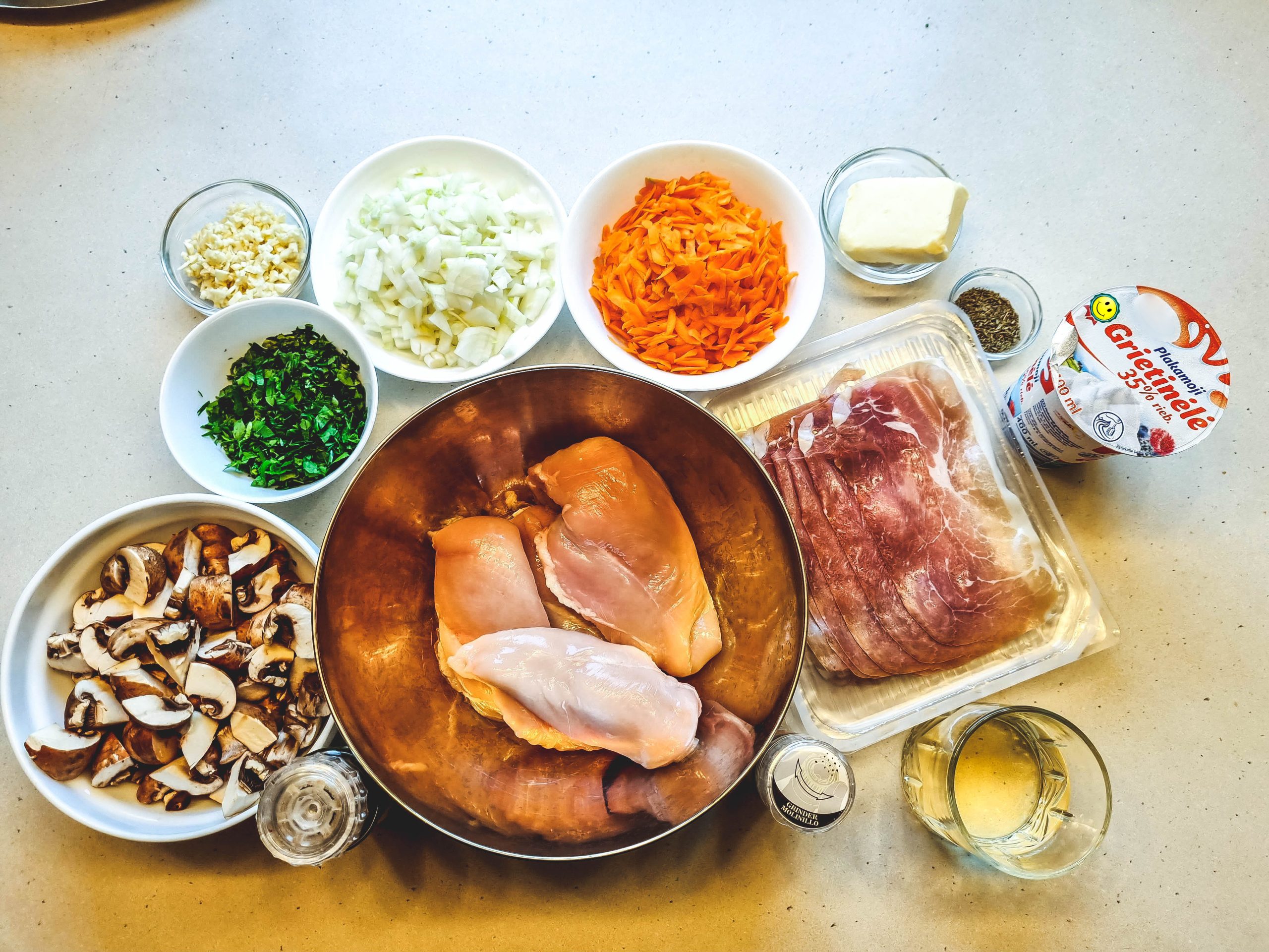 Svogūną supjaustom smulkiai. Morkas sutarkuojam ant burokinės tarkos. Grybus supjaustom gabaliukais.