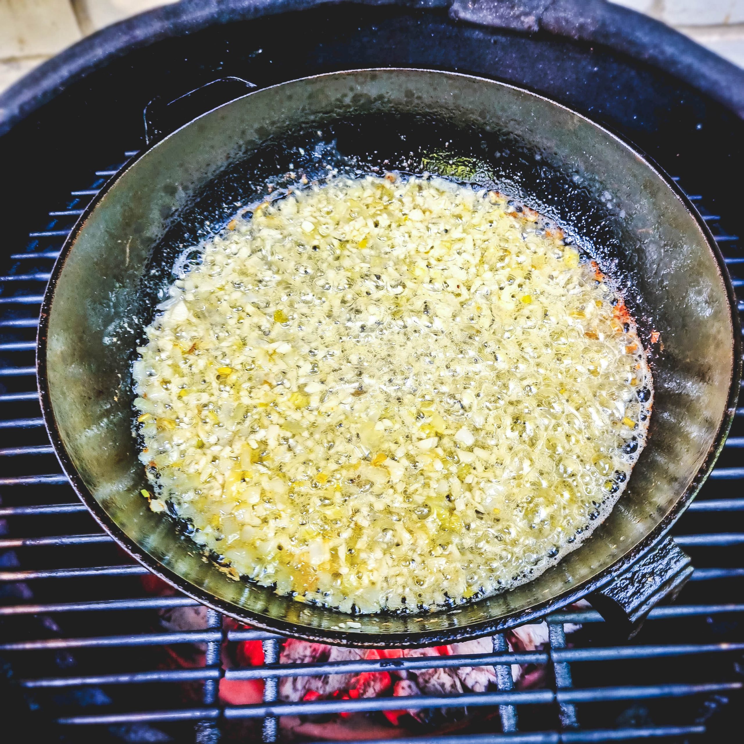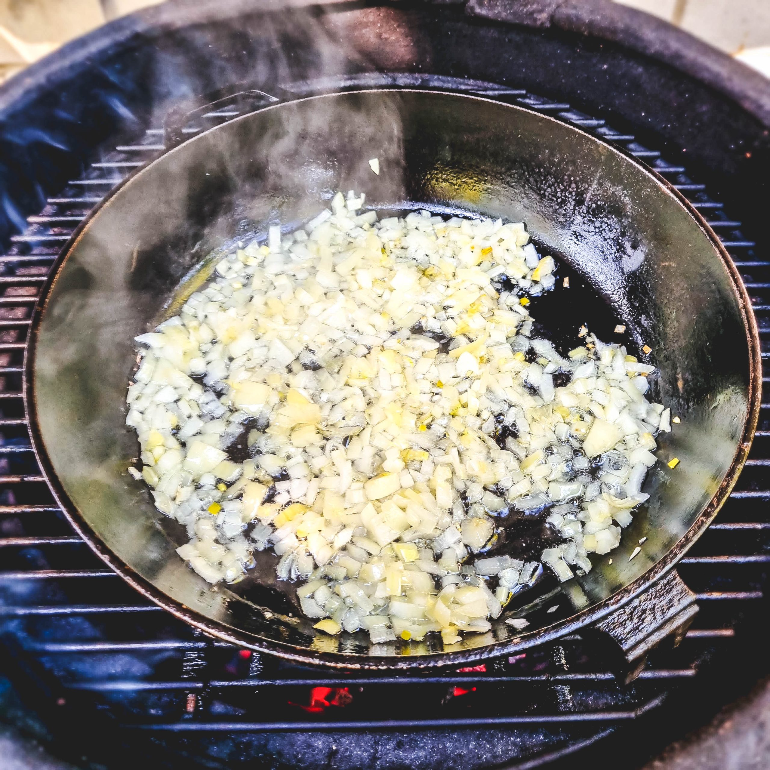 Keptuvę išvalom ir grąžinam į kepsninę. Įpilam truputį aliejaus. Dedam gabaliuką sviesto. Suberiam svogūnus. Pamaišydami apkepam kol suminkštės.
