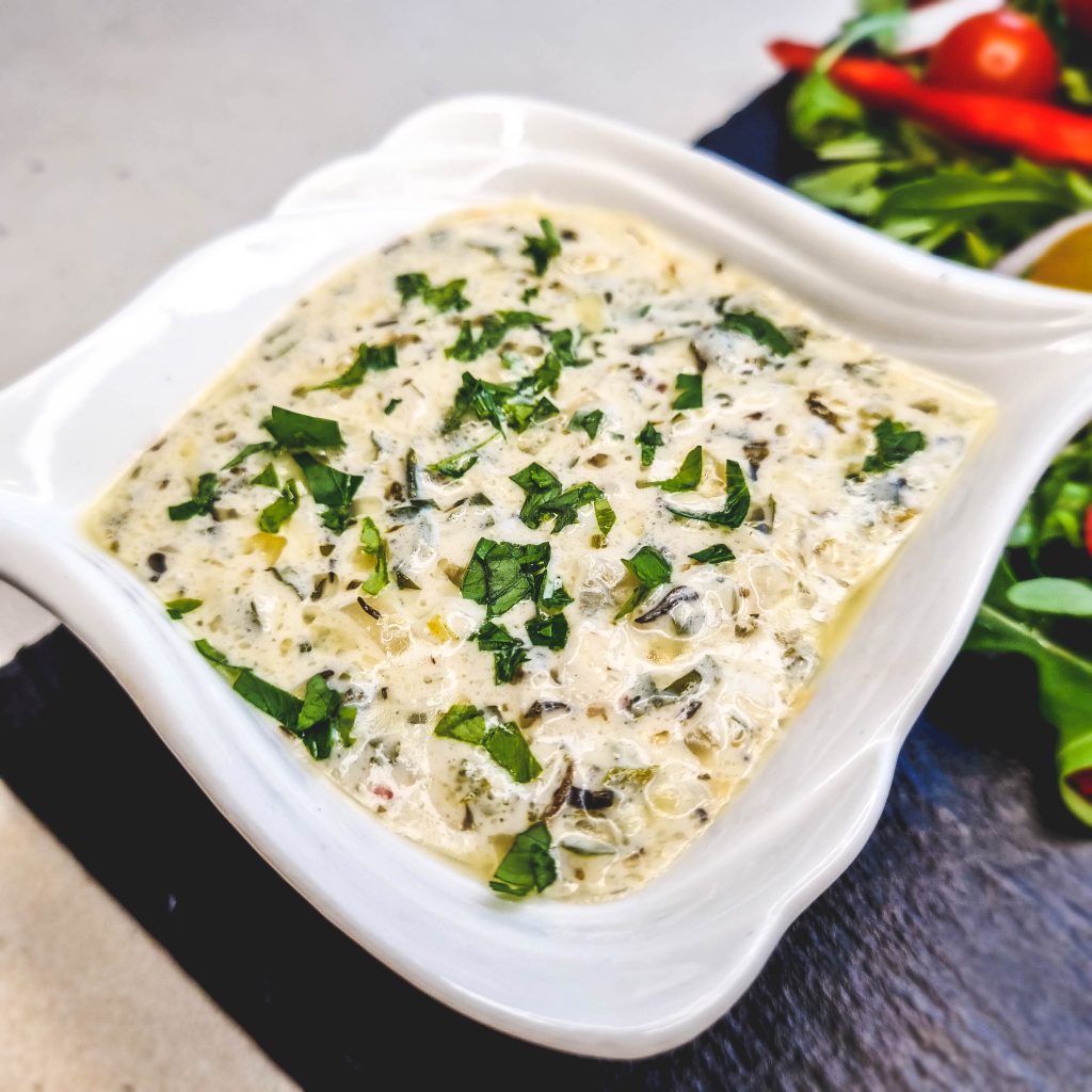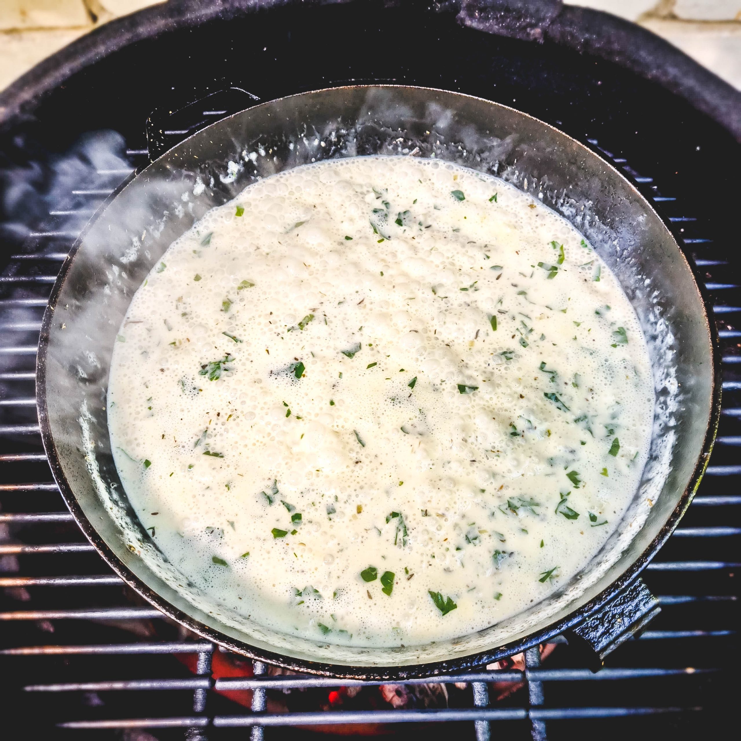 Suberiam česnakus. Supilam baltą vyną. Išmaišom. Supilam grietinėlę. Išmaišom. Pagardinam druska ir pipirais. Suberiam čiobrelio prieskonius. Išmaišom.