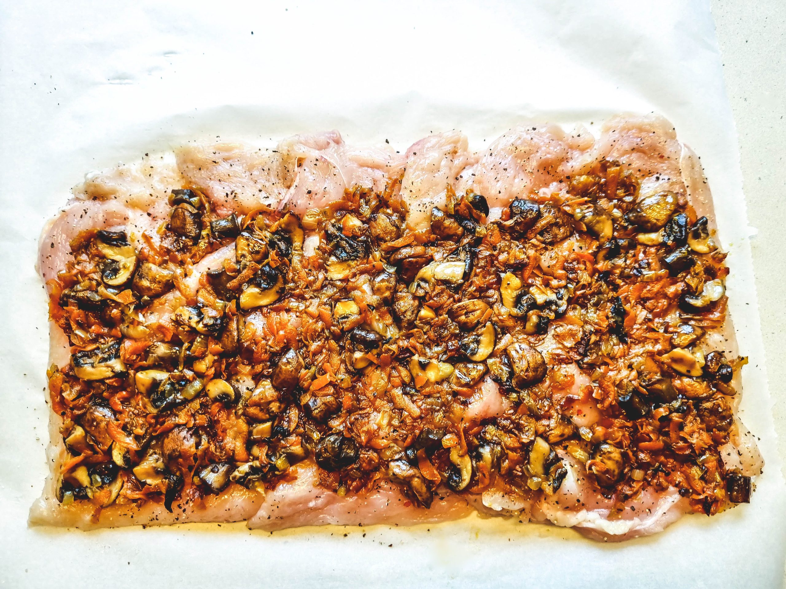 Pagardinam druska ir pipirais. Sudedam ir tolygiai paskirstom pasigamintą įdarą. Tolygiai susukam.